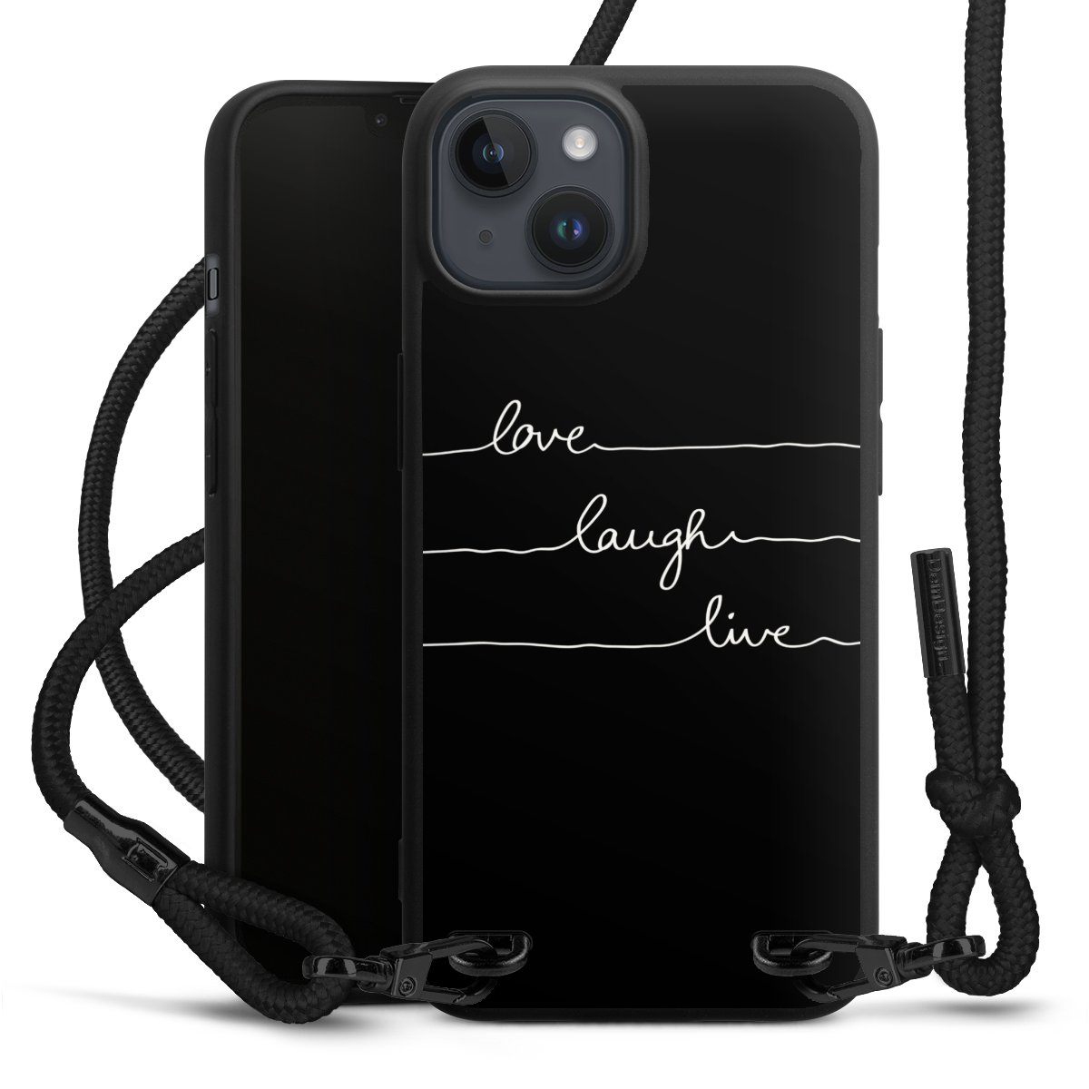 The matt black silicone case is made of flexible TPU (thermoplastic polyurethane) and offers robust protection. The durable, unbreakable material makes the cover flexible and dimensionally stable at the same time. The matte surface makes your design stand out more and is less susceptible to fingerprints and dirt. The stylish trend accessory fits comfortably in the hand and is perfectly complemented by the fabric (polyester) mobile phone strap. The braided fabric strap is approx. 1.70 metres long with a diameter of approx. 0.5 cm. Due to the special knotting technique, the length of the strap can be adjusted by simply pulling it, so that you can adapt it individually to your wishes. The practical case to wear around your neck is available with the fabric strap in black. As a little icing on the cake, we have provided the strap with a chic metal fastener in matt black. The strap is securely fastened to the case with loops made of high-quality genuine leather and press studs. The ends of the fabric strap are covered with metallic end caps and thus protected from fraying.