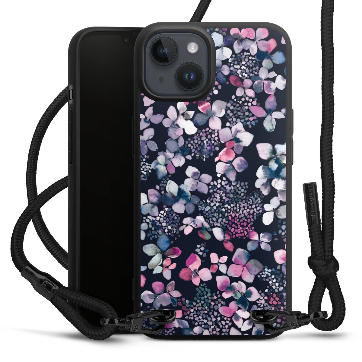 Pure Black: Phone case, fabric strap and metal details in stylish matt black.