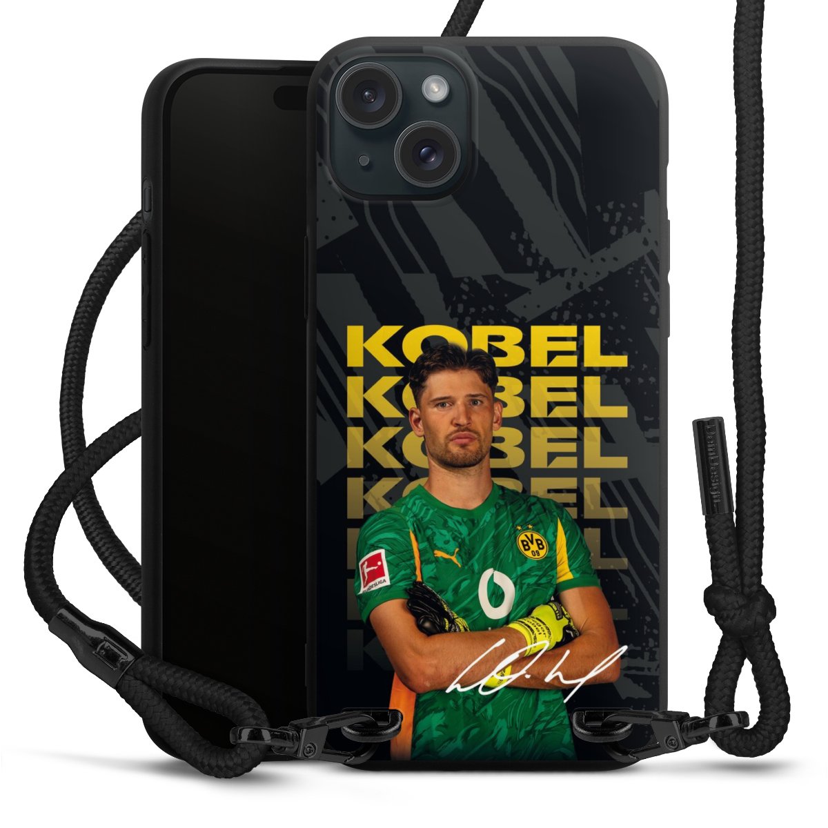 The matt black silicone case is made of flexible TPU (thermoplastic polyurethane) and offers robust protection. The durable, unbreakable material makes the cover flexible and dimensionally stable at the same time. The matte surface makes your design stand out more and is less susceptible to fingerprints and dirt. The stylish trend accessory fits comfortably in the hand and is perfectly complemented by the fabric (polyester) mobile phone strap. The braided fabric strap is approx. 1.70 metres long with a diameter of approx. 0.5 cm. Due to the special knotting technique, the length of the strap can be adjusted by simply pulling it, so that you can adapt it individually to your wishes. The practical case to wear around your neck is available with the fabric strap in black. As a little icing on the cake, we have provided the strap with a chic metal fastener in matt black. The strap is securely fastened to the case with loops made of high-quality genuine leather and press studs. The ends of the fabric strap are covered with metallic end caps and thus protected from fraying.