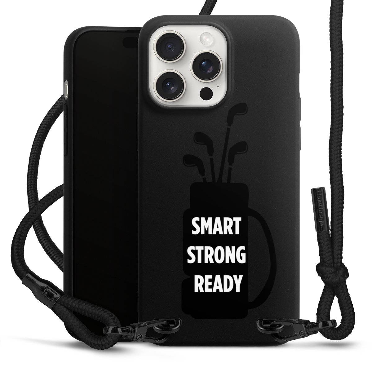 Pure Black: Phone case, fabric strap and metal details in stylish matt black.