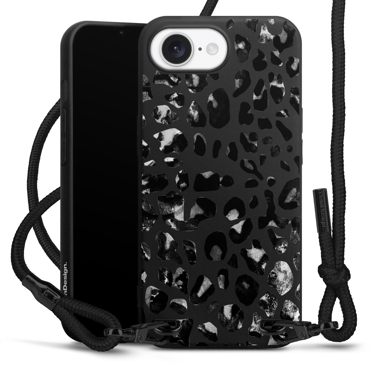 The matt black silicone case is made of flexible TPU (thermoplastic polyurethane) and offers robust protection. The durable, unbreakable material makes the cover flexible and dimensionally stable at the same time. The matte surface makes your design stand out more and is less susceptible to fingerprints and dirt. The stylish trend accessory fits comfortably in the hand and is perfectly complemented by the fabric (polyester) mobile phone strap. The braided fabric strap is approx. 1.70 metres long with a diameter of approx. 0.5 cm. Due to the special knotting technique, the length of the strap can be adjusted by simply pulling it, so that you can adapt it individually to your wishes. The practical case to wear around your neck is available with the fabric strap in black. As a little icing on the cake, we have provided the strap with a chic metal fastener in matt black. The strap is securely fastened to the case with loops made of high-quality genuine leather and press studs. The ends of the fabric strap are covered with metallic end caps and thus protected from fraying.