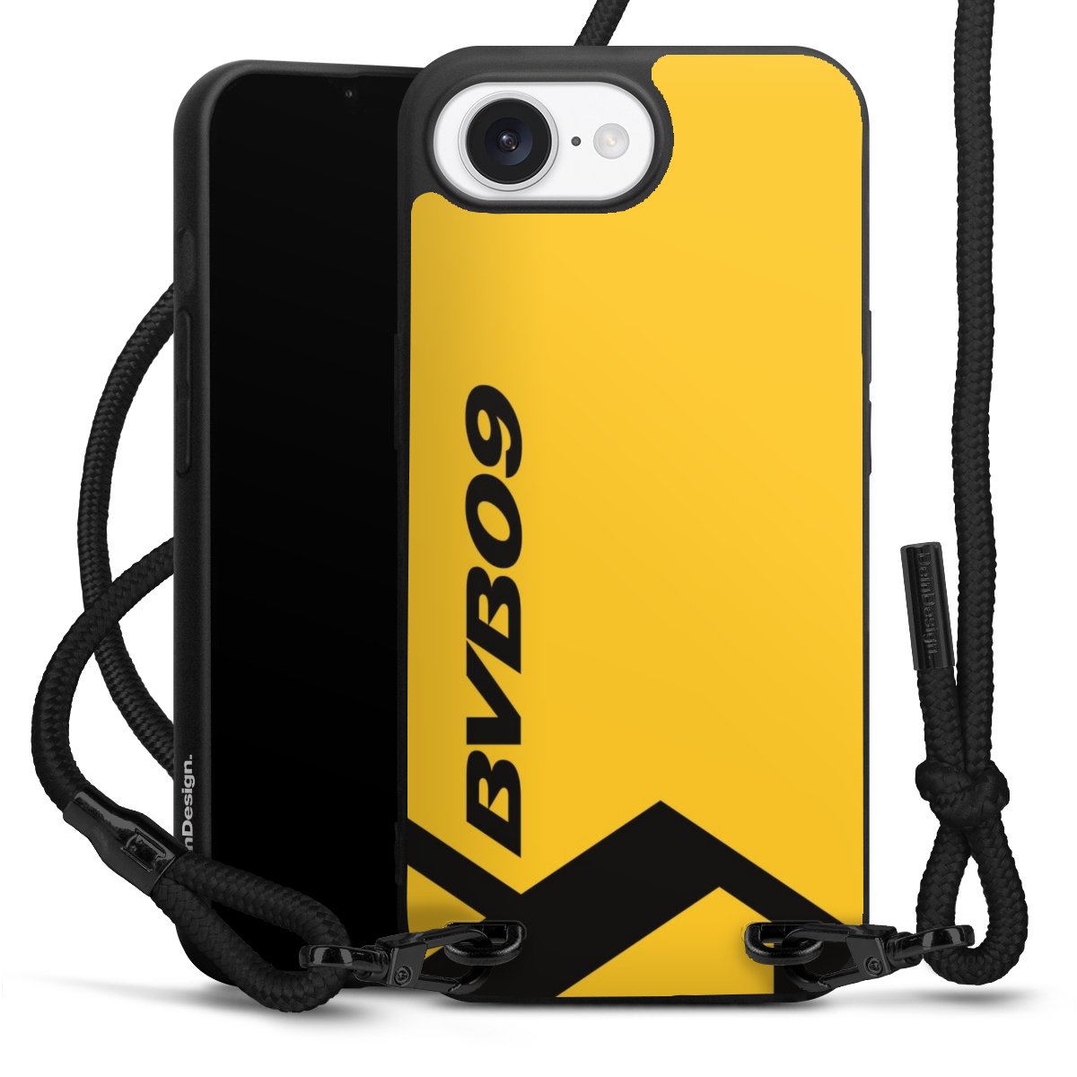 The matt black silicone case is made of flexible TPU (thermoplastic polyurethane) and offers robust protection. The durable, unbreakable material makes the cover flexible and dimensionally stable at the same time. The matte surface makes your design stand out more and is less susceptible to fingerprints and dirt. The stylish trend accessory fits comfortably in the hand and is perfectly complemented by the fabric (polyester) mobile phone strap. The braided fabric strap is approx. 1.70 metres long with a diameter of approx. 0.5 cm. Due to the special knotting technique, the length of the strap can be adjusted by simply pulling it, so that you can adapt it individually to your wishes. The practical case to wear around your neck is available with the fabric strap in black. As a little icing on the cake, we have provided the strap with a chic metal fastener in matt black. The strap is securely fastened to the case with loops made of high-quality genuine leather and press studs. The ends of the fabric strap are covered with metallic end caps and thus protected from fraying.