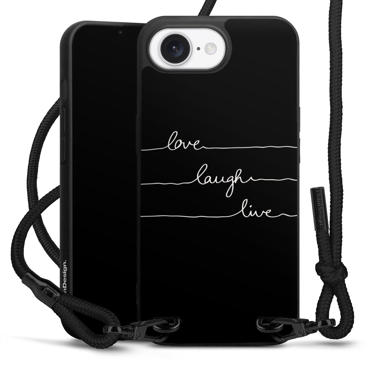 The matt black silicone case is made of flexible TPU (thermoplastic polyurethane) and offers robust protection. The durable, unbreakable material makes the cover flexible and dimensionally stable at the same time. The matte surface makes your design stand out more and is less susceptible to fingerprints and dirt. The stylish trend accessory fits comfortably in the hand and is perfectly complemented by the fabric (polyester) mobile phone strap. The braided fabric strap is approx. 1.70 metres long with a diameter of approx. 0.5 cm. Due to the special knotting technique, the length of the strap can be adjusted by simply pulling it, so that you can adapt it individually to your wishes. The practical case to wear around your neck is available with the fabric strap in black. As a little icing on the cake, we have provided the strap with a chic metal fastener in matt black. The strap is securely fastened to the case with loops made of high-quality genuine leather and press studs. The ends of the fabric strap are covered with metallic end caps and thus protected from fraying.