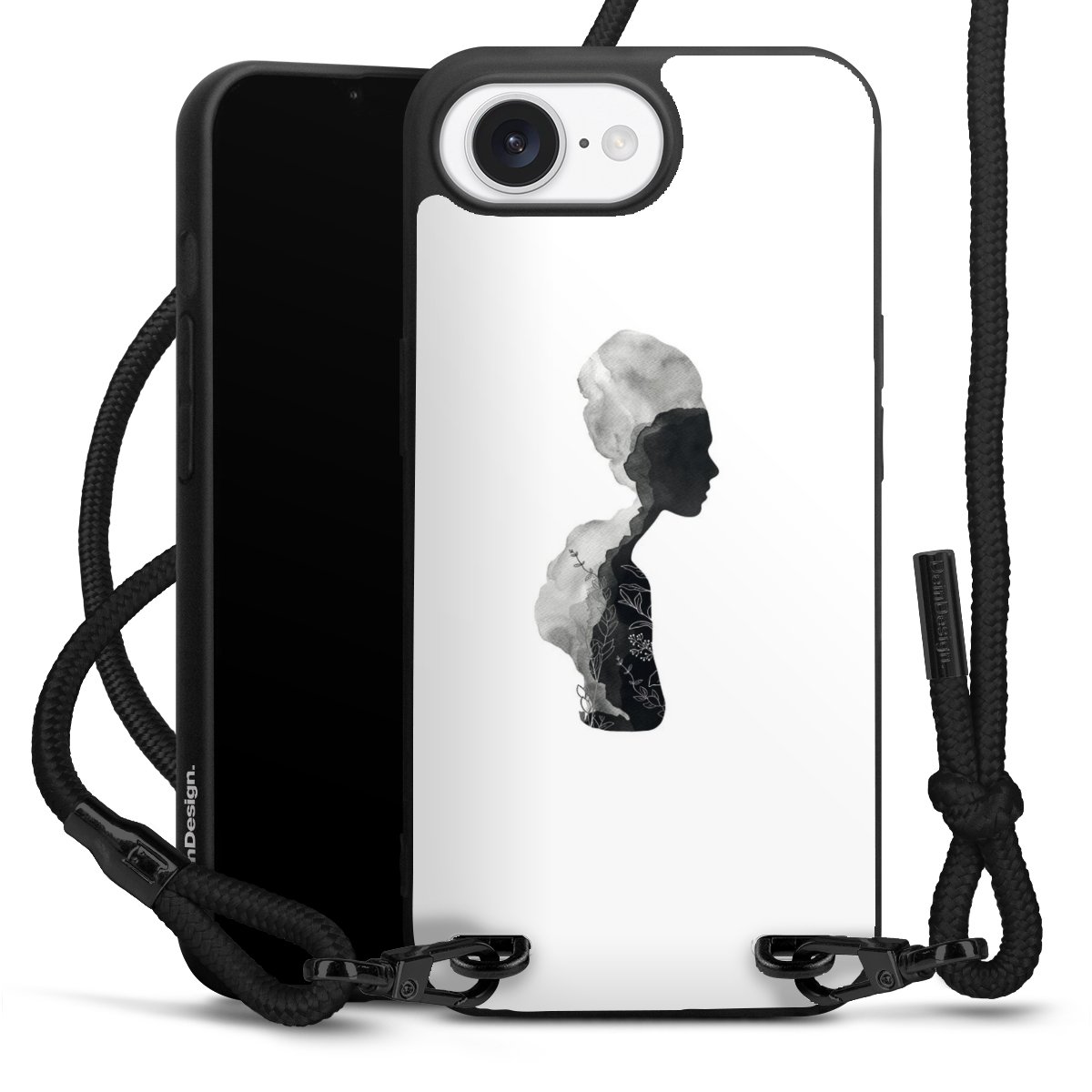 The matt black silicone case is made of flexible TPU (thermoplastic polyurethane) and offers robust protection. The durable, unbreakable material makes the cover flexible and dimensionally stable at the same time. The matte surface makes your design stand out more and is less susceptible to fingerprints and dirt. The stylish trend accessory fits comfortably in the hand and is perfectly complemented by the fabric (polyester) mobile phone strap. The braided fabric strap is approx. 1.70 metres long with a diameter of approx. 0.5 cm. Due to the special knotting technique, the length of the strap can be adjusted by simply pulling it, so that you can adapt it individually to your wishes. The practical case to wear around your neck is available with the fabric strap in black. As a little icing on the cake, we have provided the strap with a chic metal fastener in matt black. The strap is securely fastened to the case with loops made of high-quality genuine leather and press studs. The ends of the fabric strap are covered with metallic end caps and thus protected from fraying.