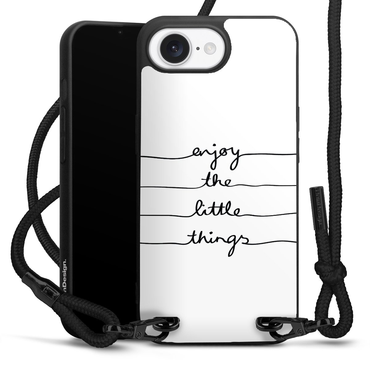 The matt black silicone case is made of flexible TPU (thermoplastic polyurethane) and offers robust protection. The durable, unbreakable material makes the cover flexible and dimensionally stable at the same time. The matte surface makes your design stand out more and is less susceptible to fingerprints and dirt. The stylish trend accessory fits comfortably in the hand and is perfectly complemented by the fabric (polyester) mobile phone strap. The braided fabric strap is approx. 1.70 metres long with a diameter of approx. 0.5 cm. Due to the special knotting technique, the length of the strap can be adjusted by simply pulling it, so that you can adapt it individually to your wishes. The practical case to wear around your neck is available with the fabric strap in black. As a little icing on the cake, we have provided the strap with a chic metal fastener in matt black. The strap is securely fastened to the case with loops made of high-quality genuine leather and press studs. The ends of the fabric strap are covered with metallic end caps and thus protected from fraying.