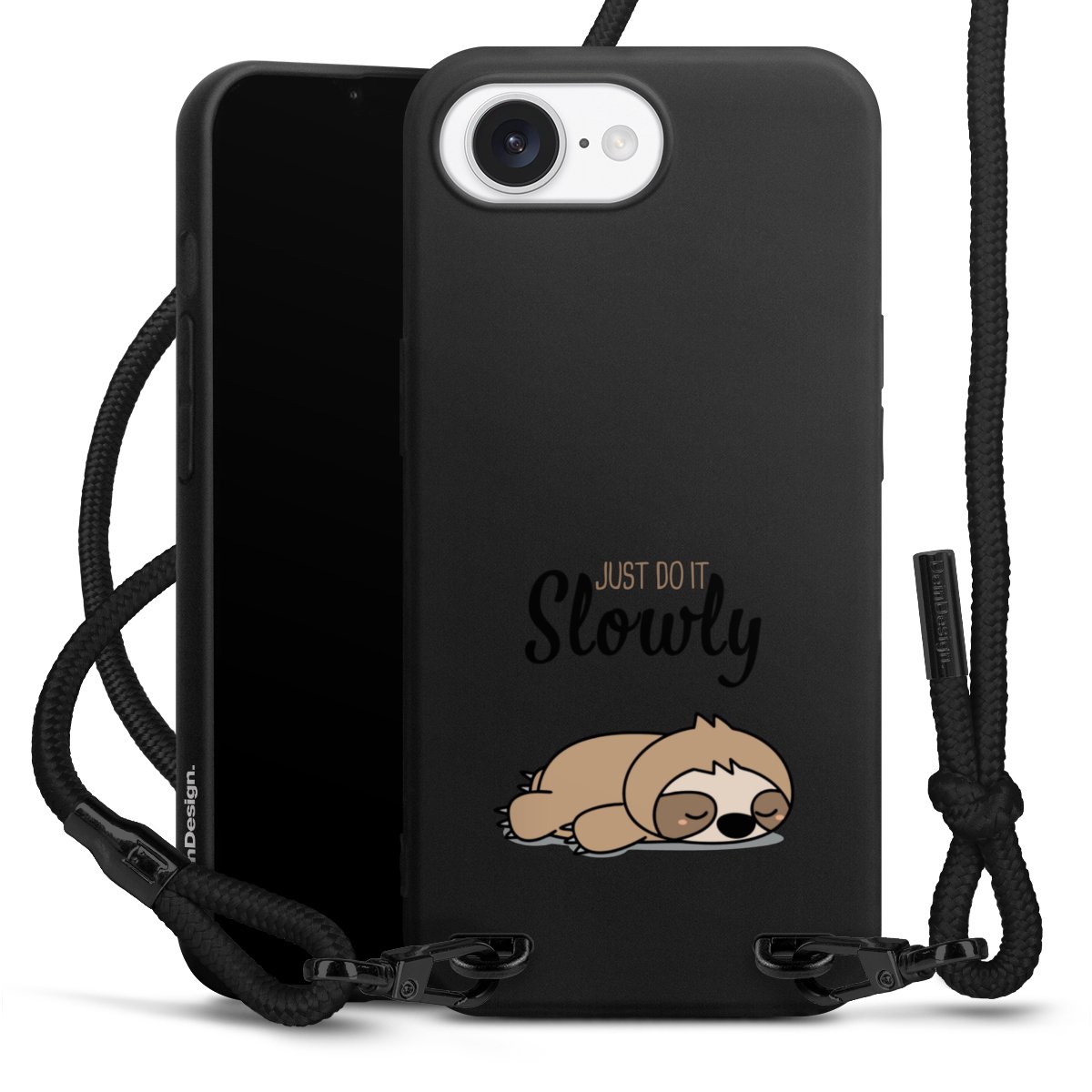 The matt black silicone case is made of flexible TPU (thermoplastic polyurethane) and offers robust protection. The durable, unbreakable material makes the cover flexible and dimensionally stable at the same time. The matte surface makes your design stand out more and is less susceptible to fingerprints and dirt. The stylish trend accessory fits comfortably in the hand and is perfectly complemented by the fabric (polyester) mobile phone strap. The braided fabric strap is approx. 1.70 metres long with a diameter of approx. 0.5 cm. Due to the special knotting technique, the length of the strap can be adjusted by simply pulling it, so that you can adapt it individually to your wishes. The practical case to wear around your neck is available with the fabric strap in black. As a little icing on the cake, we have provided the strap with a chic metal fastener in matt black. The strap is securely fastened to the case with loops made of high-quality genuine leather and press studs. The ends of the fabric strap are covered with metallic end caps and thus protected from fraying.