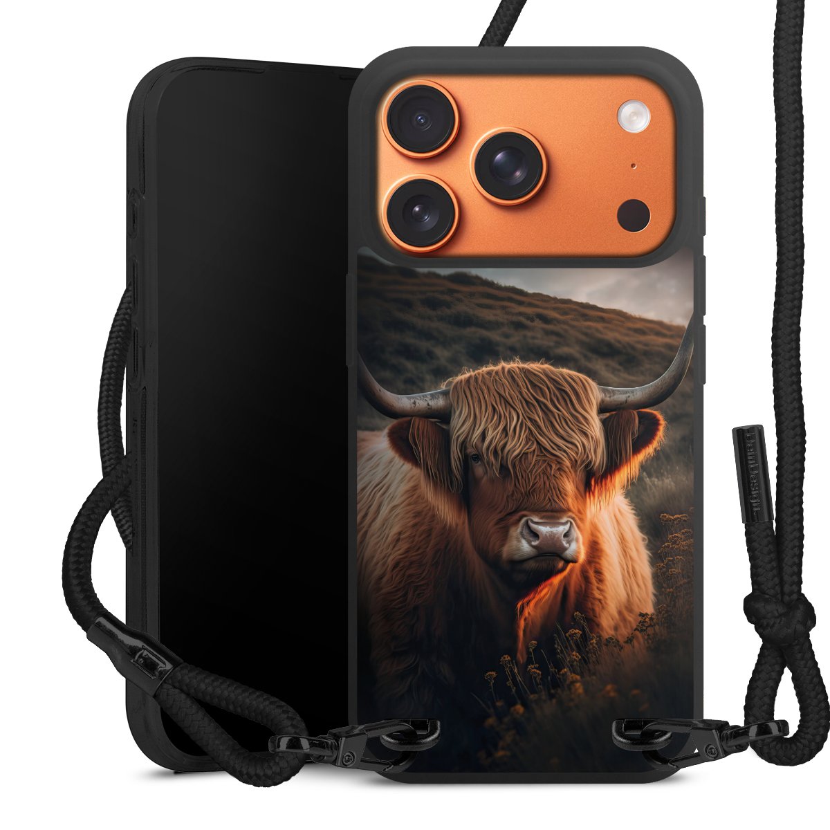 The matt black silicone case is made of flexible TPU (thermoplastic polyurethane) and offers robust protection. The durable, unbreakable material makes the cover flexible and dimensionally stable at the same time. The matte surface makes your design stand out more and is less susceptible to fingerprints and dirt. The stylish trend accessory fits comfortably in the hand and is perfectly complemented by the fabric (polyester) mobile phone strap. The braided fabric strap is approx. 1.70 metres long with a diameter of approx. 0.5 cm. Due to the special knotting technique, the length of the strap can be adjusted by simply pulling it, so that you can adapt it individually to your wishes. The practical case to wear around your neck is available with the fabric strap in black. As a little icing on the cake, we have provided the strap with a chic metal fastener in matt black. The strap is securely fastened to the case with loops made of high-quality genuine leather and press studs. The ends of the fabric strap are covered with metallic end caps and thus protected from fraying.