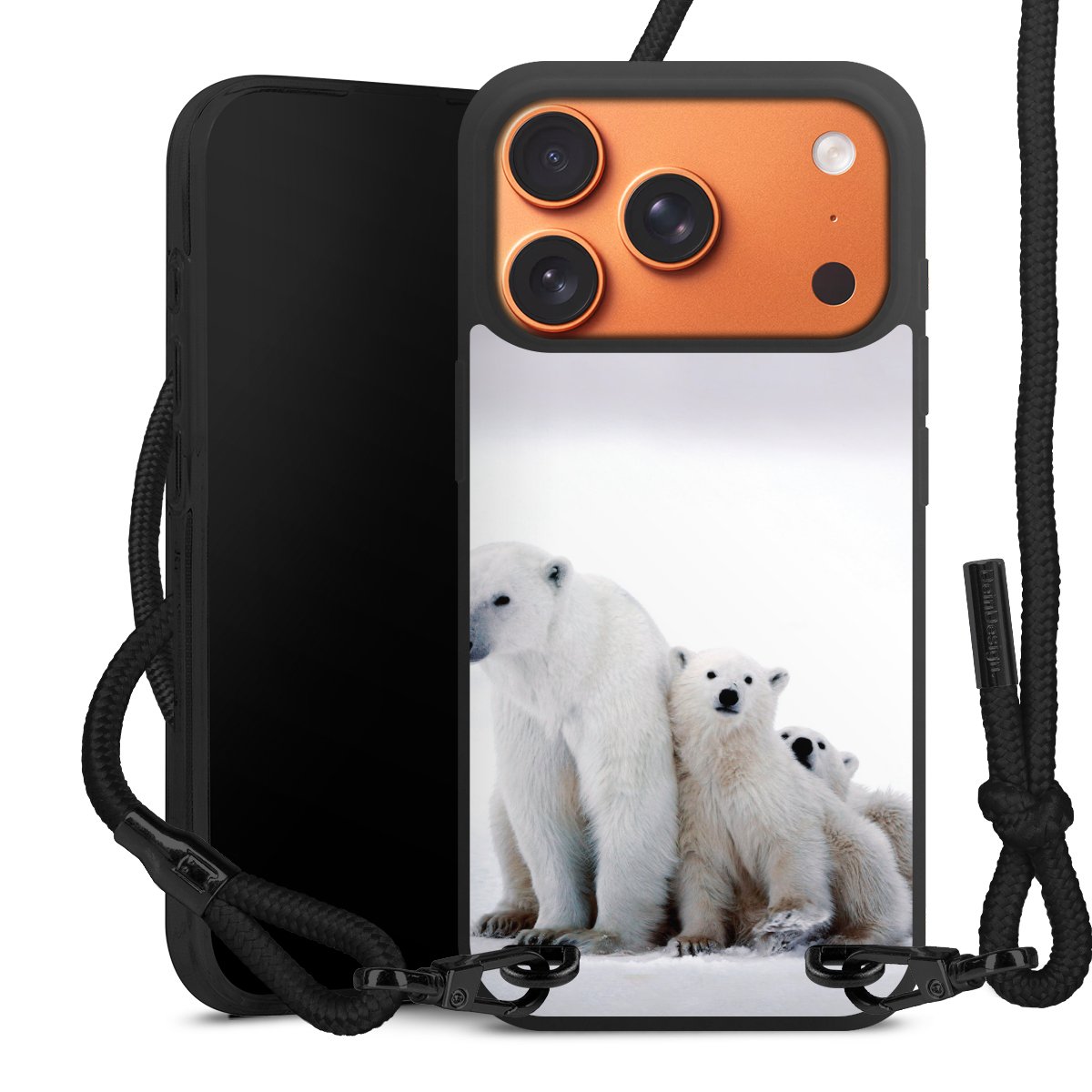 The matt black silicone case is made of flexible TPU (thermoplastic polyurethane) and offers robust protection. The durable, unbreakable material makes the cover flexible and dimensionally stable at the same time. The matte surface makes your design stand out more and is less susceptible to fingerprints and dirt. The stylish trend accessory fits comfortably in the hand and is perfectly complemented by the fabric (polyester) mobile phone strap. The braided fabric strap is approx. 1.70 metres long with a diameter of approx. 0.5 cm. Due to the special knotting technique, the length of the strap can be adjusted by simply pulling it, so that you can adapt it individually to your wishes. The practical case to wear around your neck is available with the fabric strap in black. As a little icing on the cake, we have provided the strap with a chic metal fastener in matt black. The strap is securely fastened to the case with loops made of high-quality genuine leather and press studs. The ends of the fabric strap are covered with metallic end caps and thus protected from fraying.