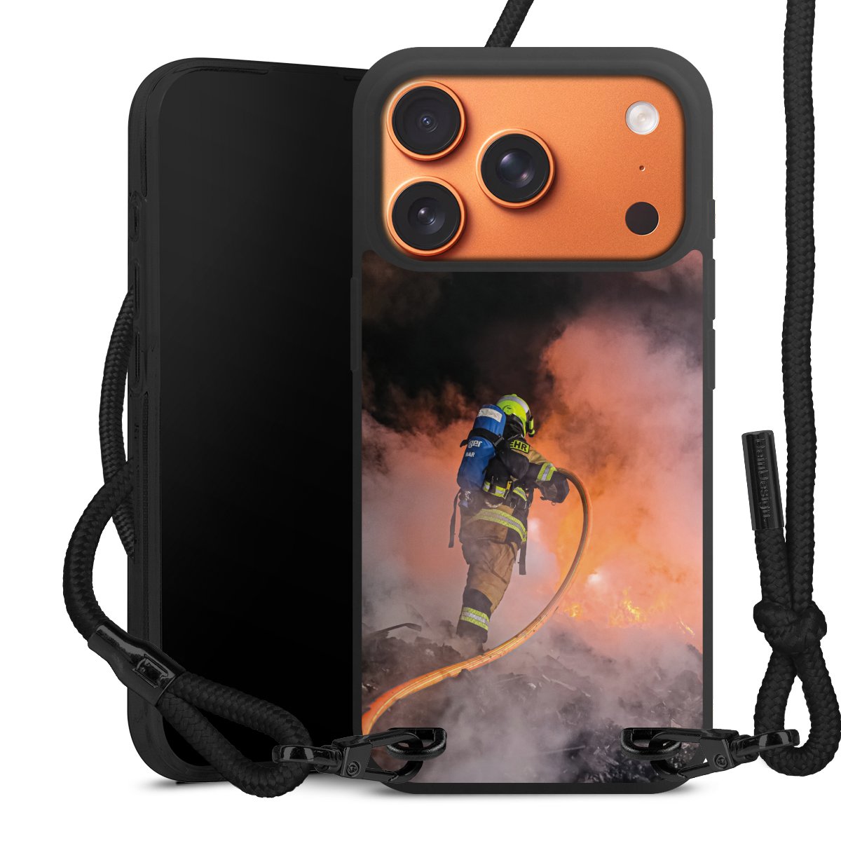 The matt black silicone case is made of flexible TPU (thermoplastic polyurethane) and offers robust protection. The durable, unbreakable material makes the cover flexible and dimensionally stable at the same time. The matte surface makes your design stand out more and is less susceptible to fingerprints and dirt. The stylish trend accessory fits comfortably in the hand and is perfectly complemented by the fabric (polyester) mobile phone strap. The braided fabric strap is approx. 1.70 metres long with a diameter of approx. 0.5 cm. Due to the special knotting technique, the length of the strap can be adjusted by simply pulling it, so that you can adapt it individually to your wishes. The practical case to wear around your neck is available with the fabric strap in black. As a little icing on the cake, we have provided the strap with a chic metal fastener in matt black. The strap is securely fastened to the case with loops made of high-quality genuine leather and press studs. The ends of the fabric strap are covered with metallic end caps and thus protected from fraying.