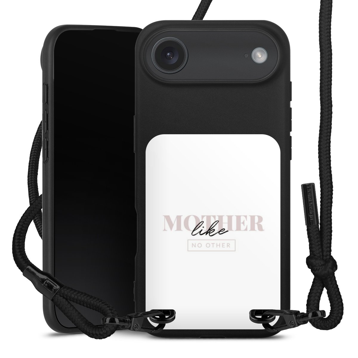 The matt black silicone case is made of flexible TPU (thermoplastic polyurethane) and offers robust protection. The durable, unbreakable material makes the cover flexible and dimensionally stable at the same time. The matte surface makes your design stand out more and is less susceptible to fingerprints and dirt. The stylish trend accessory fits comfortably in the hand and is perfectly complemented by the fabric (polyester) mobile phone strap. The braided fabric strap is approx. 1.70 metres long with a diameter of approx. 0.5 cm. Due to the special knotting technique, the length of the strap can be adjusted by simply pulling it, so that you can adapt it individually to your wishes. The practical case to wear around your neck is available with the fabric strap in black. As a little icing on the cake, we have provided the strap with a chic metal fastener in matt black. The strap is securely fastened to the case with loops made of high-quality genuine leather and press studs. The ends of the fabric strap are covered with metallic end caps and thus protected from fraying.