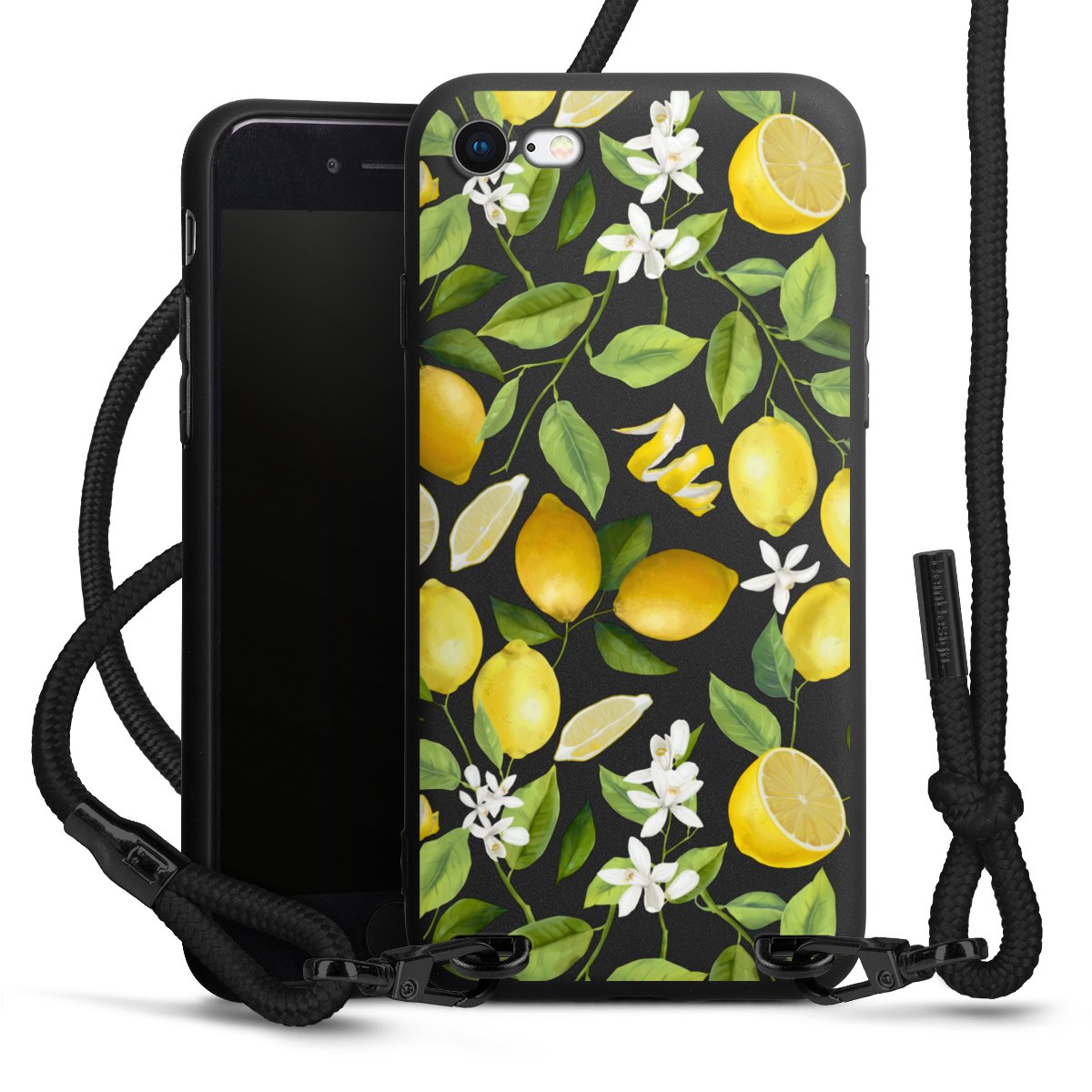 The matt black silicone case is made of flexible TPU (thermoplastic polyurethane) and offers robust protection. The durable, unbreakable material makes the cover flexible and dimensionally stable at the same time. The matte surface makes your design stand out more and is less susceptible to fingerprints and dirt. The stylish trend accessory fits comfortably in the hand and is perfectly complemented by the fabric (polyester) mobile phone strap. The braided fabric strap is approx. 1.70 metres long with a diameter of approx. 0.5 cm. Due to the special knotting technique, the length of the strap can be adjusted by simply pulling it, so that you can adapt it individually to your wishes. The practical case to wear around your neck is available with the fabric strap in black. As a little icing on the cake, we have provided the strap with a chic metal fastener in matt black. The strap is securely fastened to the case with loops made of high-quality genuine leather and press studs. The ends of the fabric strap are covered with metallic end caps and thus protected from fraying.