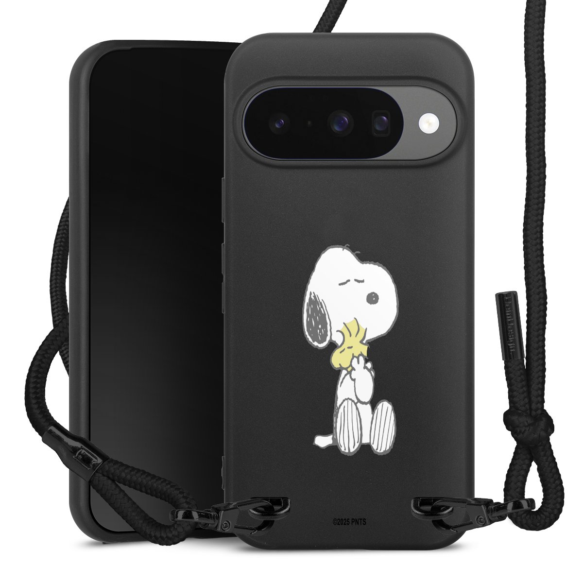 The matt black silicone case is made of flexible TPU (thermoplastic polyurethane) and offers robust protection. The durable, unbreakable material makes the cover flexible and dimensionally stable at the same time. The matte surface makes your design stand out more and is less susceptible to fingerprints and dirt. The stylish trend accessory fits comfortably in the hand and is perfectly complemented by the fabric (polyester) mobile phone strap. The braided fabric strap is approx. 1.70 metres long with a diameter of approx. 0.5 cm. Due to the special knotting technique, the length of the strap can be adjusted by simply pulling it, so that you can adapt it individually to your wishes. The practical case to wear around your neck is available with the fabric strap in black. As a little icing on the cake, we have provided the strap with a chic metal fastener in matt black. The strap is securely fastened to the case with loops made of high-quality genuine leather and press studs. The ends of the fabric strap are covered with metallic end caps and thus protected from fraying.