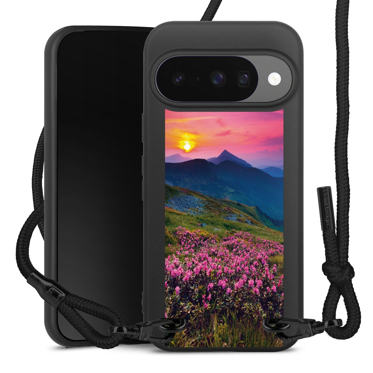 The matt black silicone case is made of flexible TPU (thermoplastic polyurethane) and offers robust protection. The durable, unbreakable material makes the cover flexible and dimensionally stable at the same time. The matte surface makes your design stand out more and is less susceptible to fingerprints and dirt. The stylish trend accessory fits comfortably in the hand and is perfectly complemented by the fabric (polyester) mobile phone strap. The braided fabric strap is approx. 1.70 metres long with a diameter of approx. 0.5 cm. Due to the special knotting technique, the length of the strap can be adjusted by simply pulling it, so that you can adapt it individually to your wishes. The practical case to wear around your neck is available with the fabric strap in black. As a little icing on the cake, we have provided the strap with a chic metal fastener in matt black. The strap is securely fastened to the case with loops made of high-quality genuine leather and press studs. The ends of the fabric strap are covered with metallic end caps and thus protected from fraying.