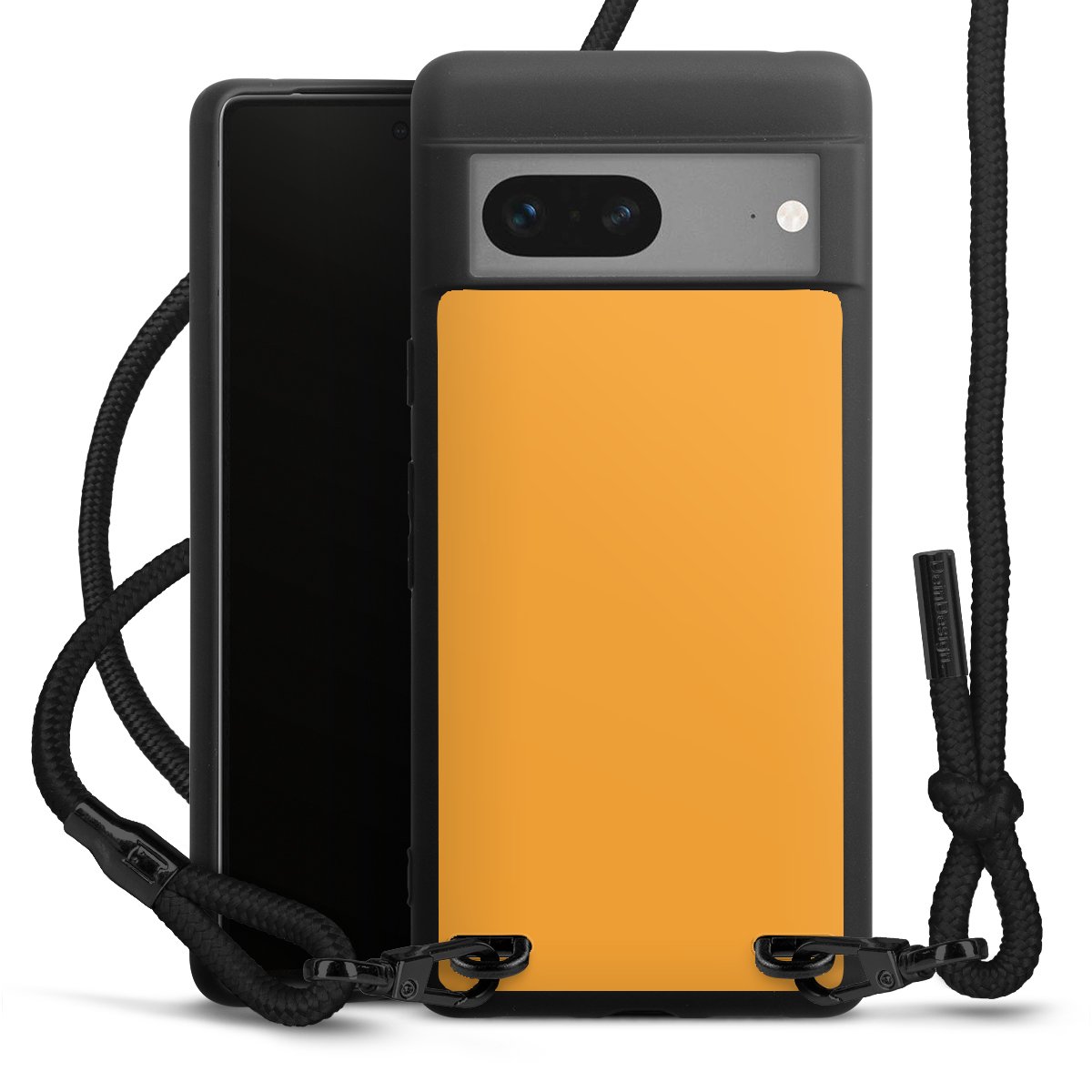The matt black silicone case is made of flexible TPU (thermoplastic polyurethane) and offers robust protection. The durable, unbreakable material makes the cover flexible and dimensionally stable at the same time. The matte surface makes your design stand out more and is less susceptible to fingerprints and dirt. The stylish trend accessory fits comfortably in the hand and is perfectly complemented by the fabric (polyester) mobile phone strap. The braided fabric strap is approx. 1.70 metres long with a diameter of approx. 0.5 cm. Due to the special knotting technique, the length of the strap can be adjusted by simply pulling it, so that you can adapt it individually to your wishes. The practical case to wear around your neck is available with the fabric strap in black. As a little icing on the cake, we have provided the strap with a chic metal fastener in matt black. The strap is securely fastened to the case with loops made of high-quality genuine leather and press studs. The ends of the fabric strap are covered with metallic end caps and thus protected from fraying.
