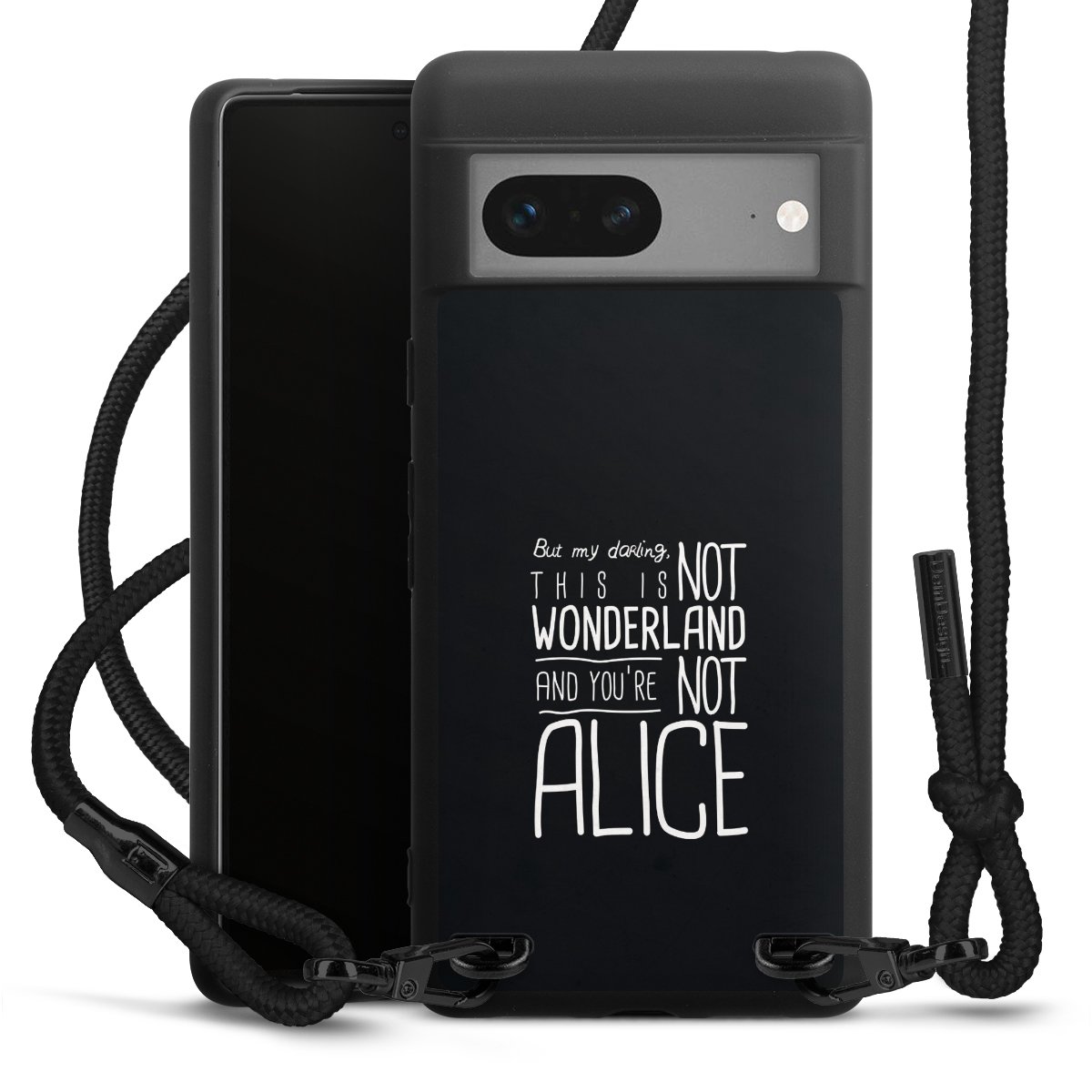 The matt black silicone case is made of flexible TPU (thermoplastic polyurethane) and offers robust protection. The durable, unbreakable material makes the cover flexible and dimensionally stable at the same time. The matte surface makes your design stand out more and is less susceptible to fingerprints and dirt. The stylish trend accessory fits comfortably in the hand and is perfectly complemented by the fabric (polyester) mobile phone strap. The braided fabric strap is approx. 1.70 metres long with a diameter of approx. 0.5 cm. Due to the special knotting technique, the length of the strap can be adjusted by simply pulling it, so that you can adapt it individually to your wishes. The practical case to wear around your neck is available with the fabric strap in black. As a little icing on the cake, we have provided the strap with a chic metal fastener in matt black. The strap is securely fastened to the case with loops made of high-quality genuine leather and press studs. The ends of the fabric strap are covered with metallic end caps and thus protected from fraying.