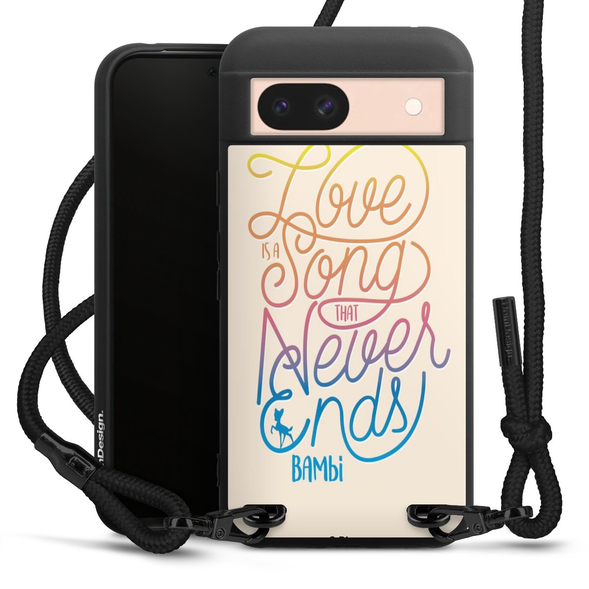 The matt black silicone case is made of flexible TPU (thermoplastic polyurethane) and offers robust protection. The durable, unbreakable material makes the cover flexible and dimensionally stable at the same time. The matte surface makes your design stand out more and is less susceptible to fingerprints and dirt. The stylish trend accessory fits comfortably in the hand and is perfectly complemented by the fabric (polyester) mobile phone strap. The braided fabric strap is approx. 1.70 metres long with a diameter of approx. 0.5 cm. Due to the special knotting technique, the length of the strap can be adjusted by simply pulling it, so that you can adapt it individually to your wishes. The practical case to wear around your neck is available with the fabric strap in black. As a little icing on the cake, we have provided the strap with a chic metal fastener in matt black. The strap is securely fastened to the case with loops made of high-quality genuine leather and press studs. The ends of the fabric strap are covered with metallic end caps and thus protected from fraying.