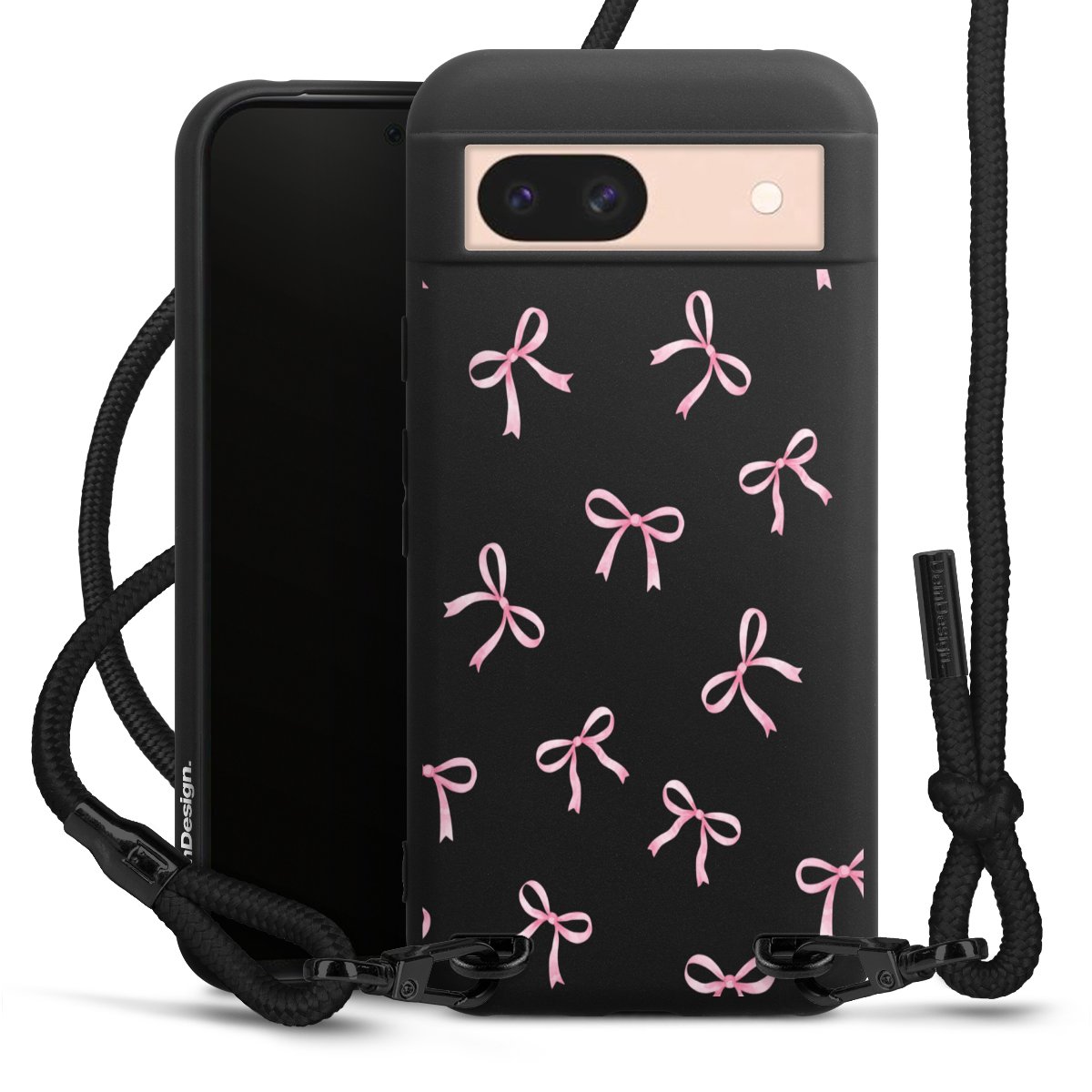The matt black silicone case is made of flexible TPU (thermoplastic polyurethane) and offers robust protection. The durable, unbreakable material makes the cover flexible and dimensionally stable at the same time. The matte surface makes your design stand out more and is less susceptible to fingerprints and dirt. The stylish trend accessory fits comfortably in the hand and is perfectly complemented by the fabric (polyester) mobile phone strap. The braided fabric strap is approx. 1.70 metres long with a diameter of approx. 0.5 cm. Due to the special knotting technique, the length of the strap can be adjusted by simply pulling it, so that you can adapt it individually to your wishes. The practical case to wear around your neck is available with the fabric strap in black. As a little icing on the cake, we have provided the strap with a chic metal fastener in matt black. The strap is securely fastened to the case with loops made of high-quality genuine leather and press studs. The ends of the fabric strap are covered with metallic end caps and thus protected from fraying.