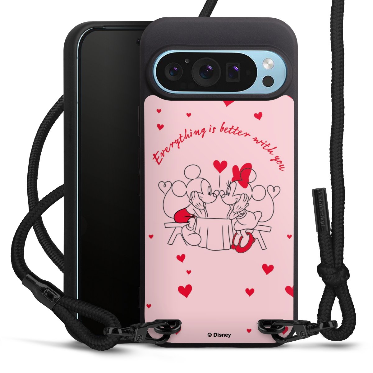 The matt black silicone case is made of flexible TPU (thermoplastic polyurethane) and offers robust protection. The durable, unbreakable material makes the cover flexible and dimensionally stable at the same time. The matte surface makes your design stand out more and is less susceptible to fingerprints and dirt. The stylish trend accessory fits comfortably in the hand and is perfectly complemented by the fabric (polyester) mobile phone strap. The braided fabric strap is approx. 1.70 metres long with a diameter of approx. 0.5 cm. Due to the special knotting technique, the length of the strap can be adjusted by simply pulling it, so that you can adapt it individually to your wishes. The practical case to wear around your neck is available with the fabric strap in black. As a little icing on the cake, we have provided the strap with a chic metal fastener in matt black. The strap is securely fastened to the case with loops made of high-quality genuine leather and press studs. The ends of the fabric strap are covered with metallic end caps and thus protected from fraying.