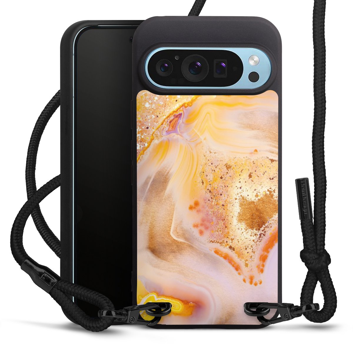 The matt black silicone case is made of flexible TPU (thermoplastic polyurethane) and offers robust protection. The durable, unbreakable material makes the cover flexible and dimensionally stable at the same time. The matte surface makes your design stand out more and is less susceptible to fingerprints and dirt. The stylish trend accessory fits comfortably in the hand and is perfectly complemented by the fabric (polyester) mobile phone strap. The braided fabric strap is approx. 1.70 metres long with a diameter of approx. 0.5 cm. Due to the special knotting technique, the length of the strap can be adjusted by simply pulling it, so that you can adapt it individually to your wishes. The practical case to wear around your neck is available with the fabric strap in black. As a little icing on the cake, we have provided the strap with a chic metal fastener in matt black. The strap is securely fastened to the case with loops made of high-quality genuine leather and press studs. The ends of the fabric strap are covered with metallic end caps and thus protected from fraying.
