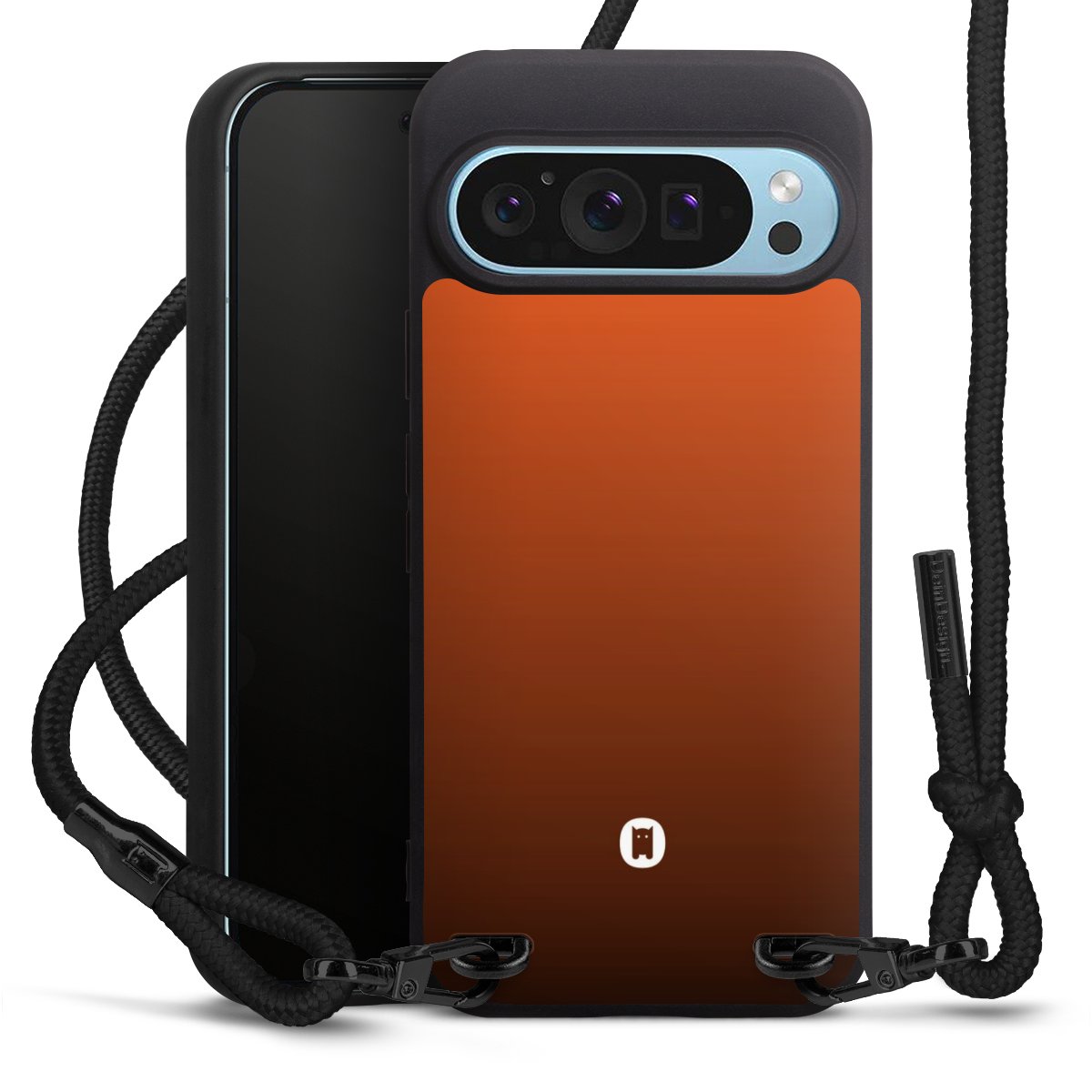 The matt black silicone case is made of flexible TPU (thermoplastic polyurethane) and offers robust protection. The durable, unbreakable material makes the cover flexible and dimensionally stable at the same time. The matte surface makes your design stand out more and is less susceptible to fingerprints and dirt. The stylish trend accessory fits comfortably in the hand and is perfectly complemented by the fabric (polyester) mobile phone strap. The braided fabric strap is approx. 1.70 metres long with a diameter of approx. 0.5 cm. Due to the special knotting technique, the length of the strap can be adjusted by simply pulling it, so that you can adapt it individually to your wishes. The practical case to wear around your neck is available with the fabric strap in black. As a little icing on the cake, we have provided the strap with a chic metal fastener in matt black. The strap is securely fastened to the case with loops made of high-quality genuine leather and press studs. The ends of the fabric strap are covered with metallic end caps and thus protected from fraying.