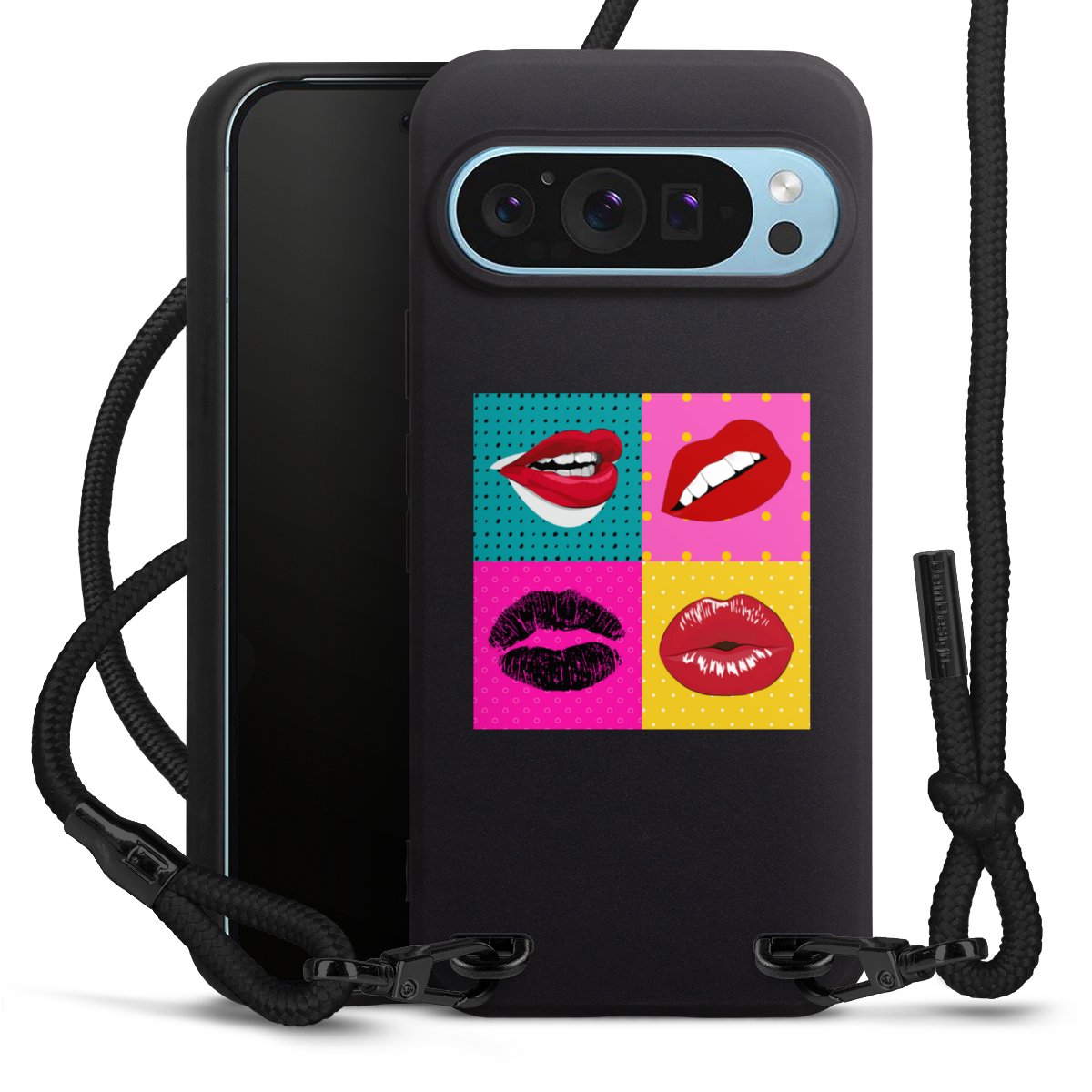 The matt black silicone case is made of flexible TPU (thermoplastic polyurethane) and offers robust protection. The durable, unbreakable material makes the cover flexible and dimensionally stable at the same time. The matte surface makes your design stand out more and is less susceptible to fingerprints and dirt. The stylish trend accessory fits comfortably in the hand and is perfectly complemented by the fabric (polyester) mobile phone strap. The braided fabric strap is approx. 1.70 metres long with a diameter of approx. 0.5 cm. Due to the special knotting technique, the length of the strap can be adjusted by simply pulling it, so that you can adapt it individually to your wishes. The practical case to wear around your neck is available with the fabric strap in black. As a little icing on the cake, we have provided the strap with a chic metal fastener in matt black. The strap is securely fastened to the case with loops made of high-quality genuine leather and press studs. The ends of the fabric strap are covered with metallic end caps and thus protected from fraying.