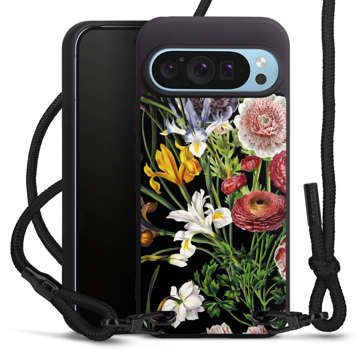Pure Black: Phone case, fabric strap and metal details in stylish matt black.