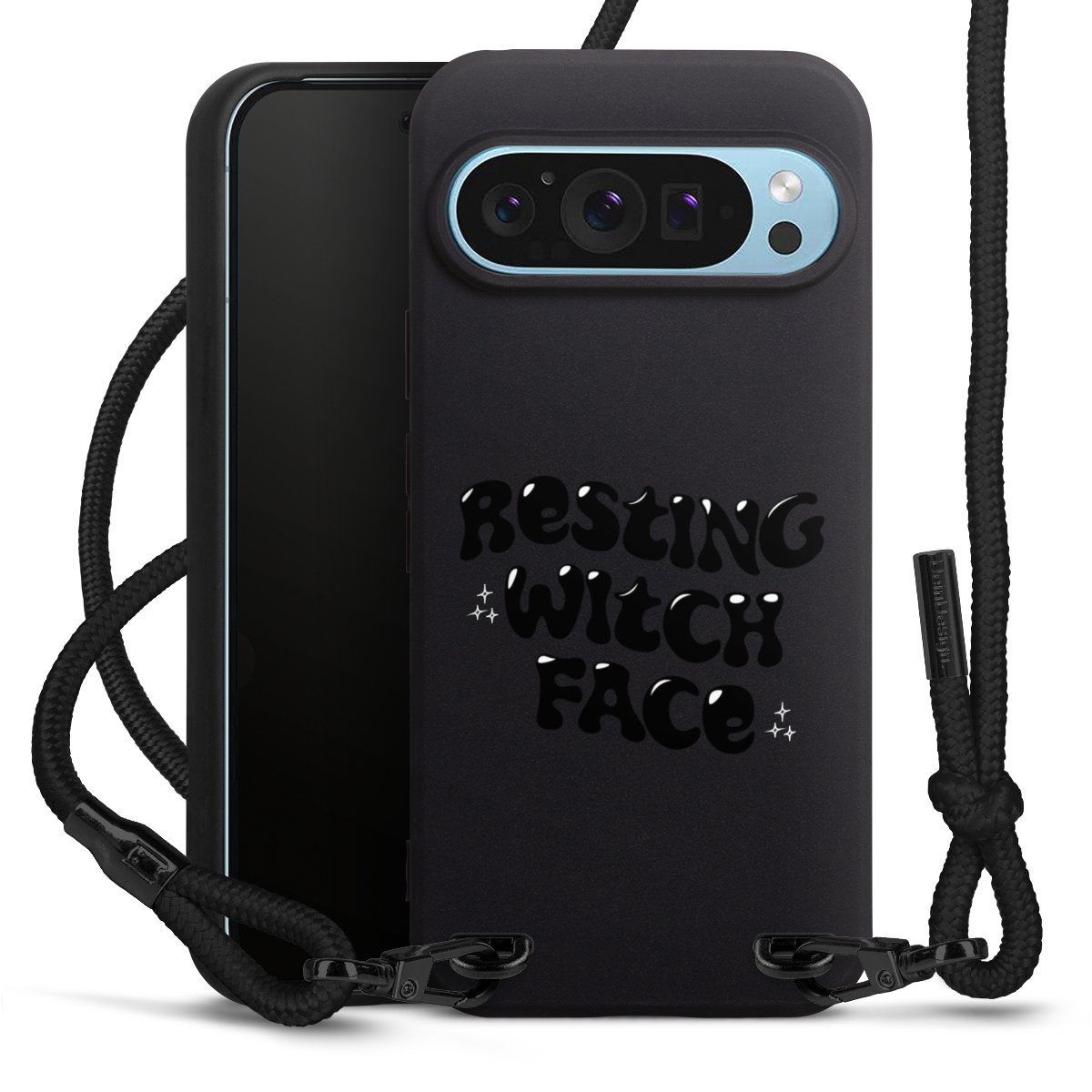 Pure Black: Phone case, fabric strap and metal details in stylish matt black.