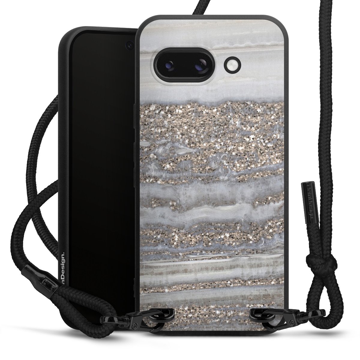 Pure Black: Phone case, fabric strap and metal details in stylish matt black.