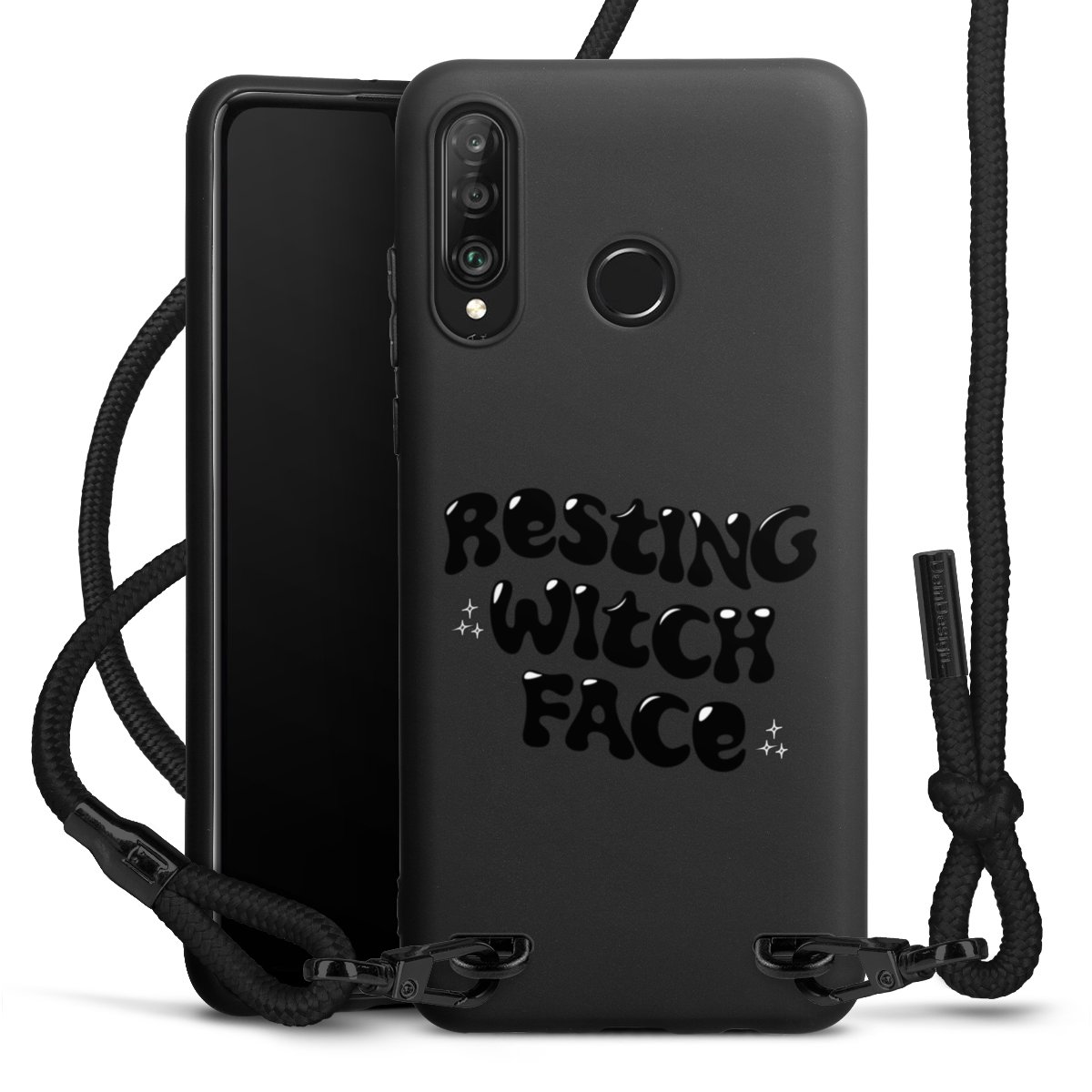 The matt black silicone case is made of flexible TPU (thermoplastic polyurethane) and offers robust protection. The durable, unbreakable material makes the cover flexible and dimensionally stable at the same time. The matte surface makes your design stand out more and is less susceptible to fingerprints and dirt. The stylish trend accessory fits comfortably in the hand and is perfectly complemented by the fabric (polyester) mobile phone strap. The braided fabric strap is approx. 1.70 metres long with a diameter of approx. 0.5 cm. Due to the special knotting technique, the length of the strap can be adjusted by simply pulling it, so that you can adapt it individually to your wishes. The practical case to wear around your neck is available with the fabric strap in black. As a little icing on the cake, we have provided the strap with a chic metal fastener in matt black. The strap is securely fastened to the case with loops made of high-quality genuine leather and press studs. The ends of the fabric strap are covered with metallic end caps and thus protected from fraying.