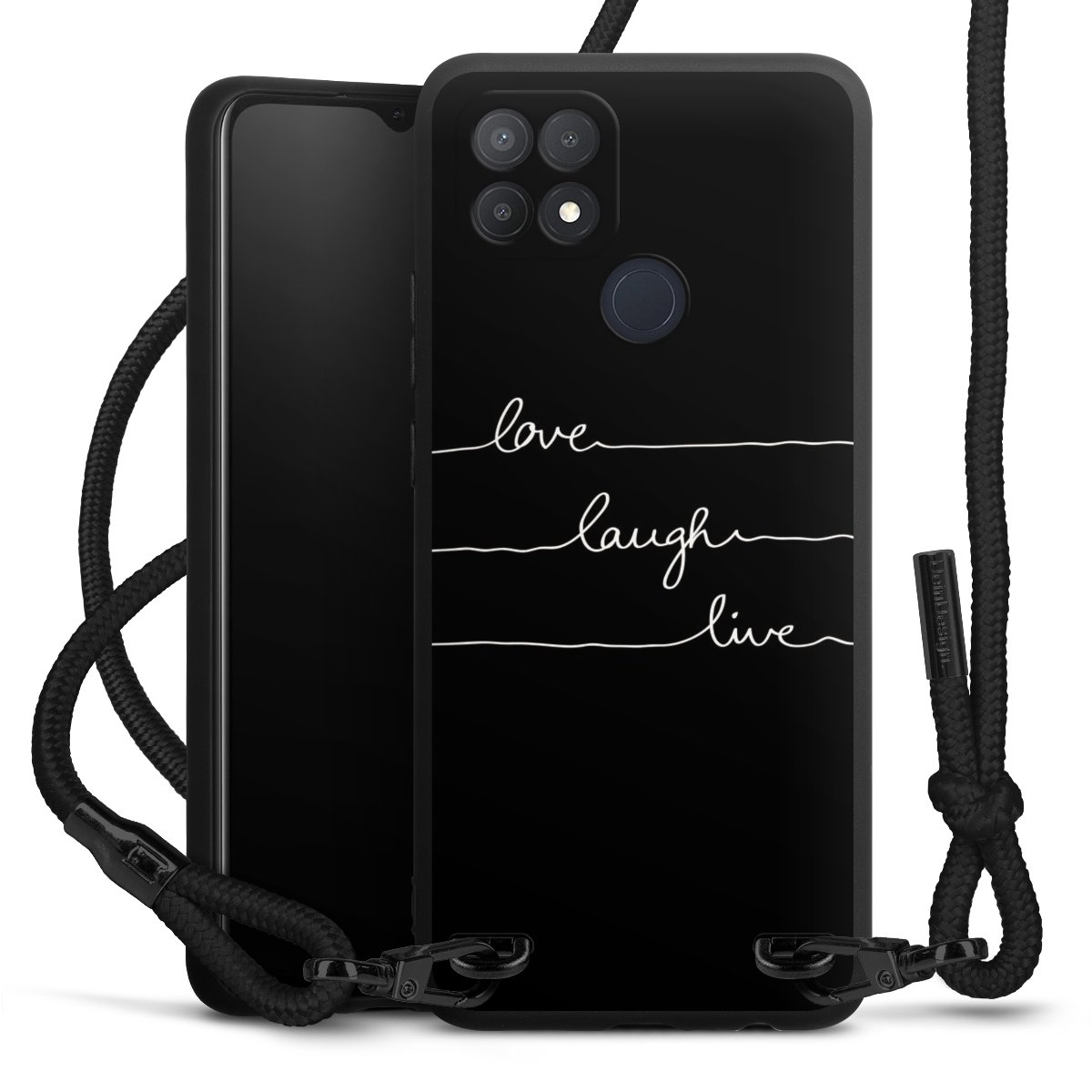 The matt black silicone case is made of flexible TPU (thermoplastic polyurethane) and offers robust protection. The durable, unbreakable material makes the cover flexible and dimensionally stable at the same time. The matte surface makes your design stand out more and is less susceptible to fingerprints and dirt. The stylish trend accessory fits comfortably in the hand and is perfectly complemented by the fabric (polyester) mobile phone strap. The braided fabric strap is approx. 1.70 metres long with a diameter of approx. 0.5 cm. Due to the special knotting technique, the length of the strap can be adjusted by simply pulling it, so that you can adapt it individually to your wishes. The practical case to wear around your neck is available with the fabric strap in black. As a little icing on the cake, we have provided the strap with a chic metal fastener in matt black. The strap is securely fastened to the case with loops made of high-quality genuine leather and press studs. The ends of the fabric strap are covered with metallic end caps and thus protected from fraying.