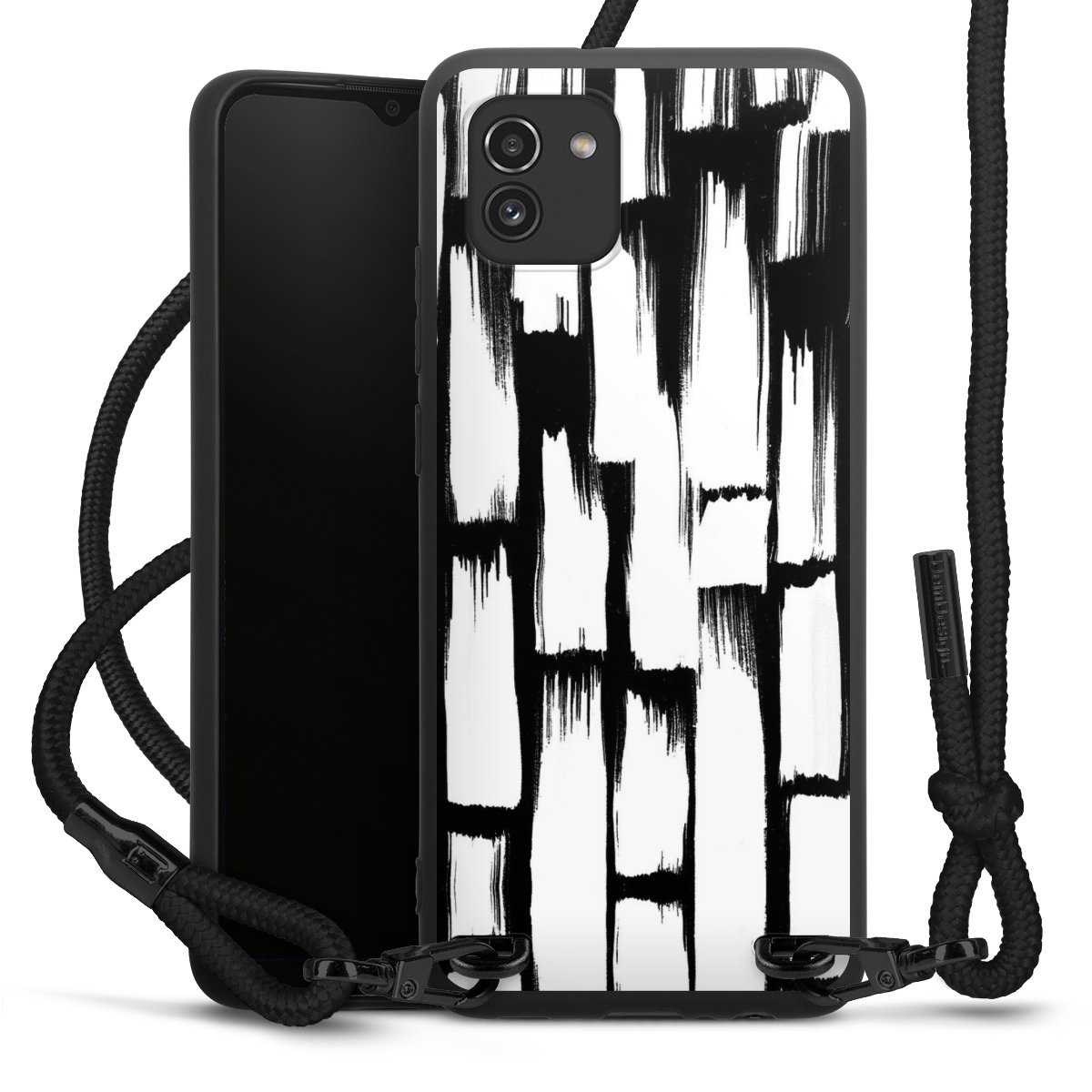 The matt black silicone case is made of flexible TPU (thermoplastic polyurethane) and offers robust protection. The durable, unbreakable material makes the cover flexible and dimensionally stable at the same time. The matte surface makes your design stand out more and is less susceptible to fingerprints and dirt. The stylish trend accessory fits comfortably in the hand and is perfectly complemented by the fabric (polyester) mobile phone strap. The braided fabric strap is approx. 1.70 metres long with a diameter of approx. 0.5 cm. Due to the special knotting technique, the length of the strap can be adjusted by simply pulling it, so that you can adapt it individually to your wishes. The practical case to wear around your neck is available with the fabric strap in black. As a little icing on the cake, we have provided the strap with a chic metal fastener in matt black. The strap is securely fastened to the case with loops made of high-quality genuine leather and press studs. The ends of the fabric strap are covered with metallic end caps and thus protected from fraying.