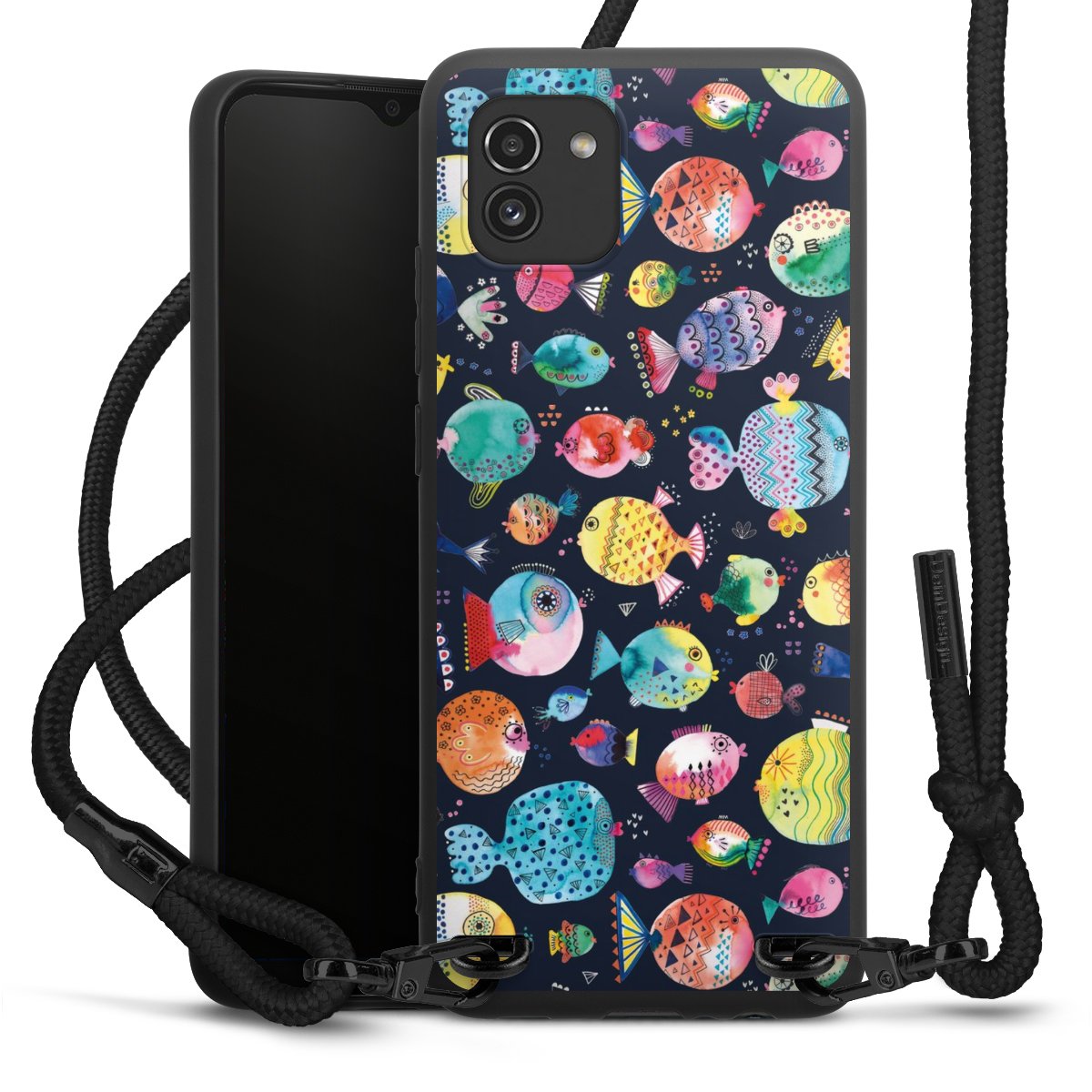 The matt black silicone case is made of flexible TPU (thermoplastic polyurethane) and offers robust protection. The durable, unbreakable material makes the cover flexible and dimensionally stable at the same time. The matte surface makes your design stand out more and is less susceptible to fingerprints and dirt. The stylish trend accessory fits comfortably in the hand and is perfectly complemented by the fabric (polyester) mobile phone strap. The braided fabric strap is approx. 1.70 metres long with a diameter of approx. 0.5 cm. Due to the special knotting technique, the length of the strap can be adjusted by simply pulling it, so that you can adapt it individually to your wishes. The practical case to wear around your neck is available with the fabric strap in black. As a little icing on the cake, we have provided the strap with a chic metal fastener in matt black. The strap is securely fastened to the case with loops made of high-quality genuine leather and press studs. The ends of the fabric strap are covered with metallic end caps and thus protected from fraying.