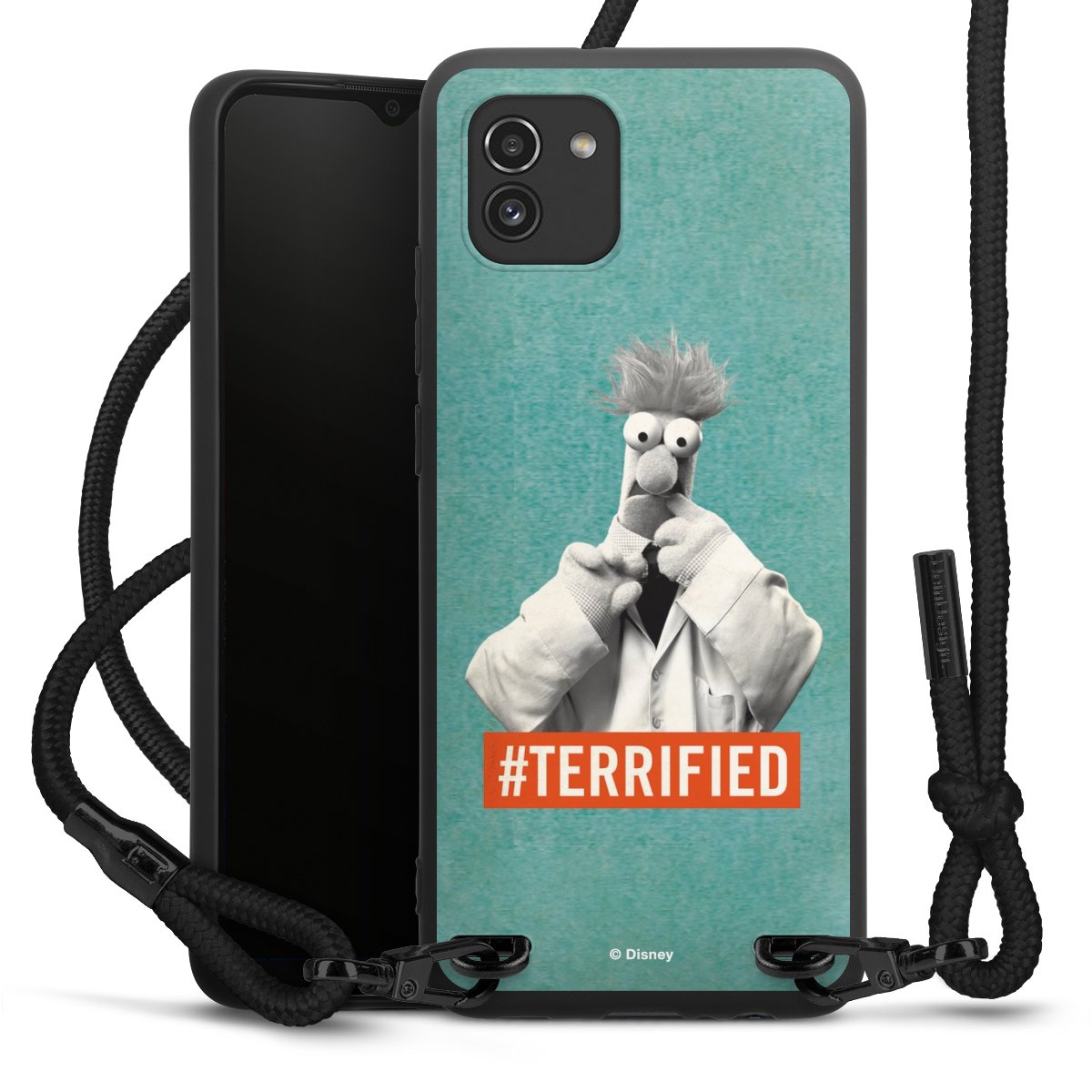 The matt black silicone case is made of flexible TPU (thermoplastic polyurethane) and offers robust protection. The durable, unbreakable material makes the cover flexible and dimensionally stable at the same time. The matte surface makes your design stand out more and is less susceptible to fingerprints and dirt. The stylish trend accessory fits comfortably in the hand and is perfectly complemented by the fabric (polyester) mobile phone strap. The braided fabric strap is approx. 1.70 metres long with a diameter of approx. 0.5 cm. Due to the special knotting technique, the length of the strap can be adjusted by simply pulling it, so that you can adapt it individually to your wishes. The practical case to wear around your neck is available with the fabric strap in black. As a little icing on the cake, we have provided the strap with a chic metal fastener in matt black. The strap is securely fastened to the case with loops made of high-quality genuine leather and press studs. The ends of the fabric strap are covered with metallic end caps and thus protected from fraying.