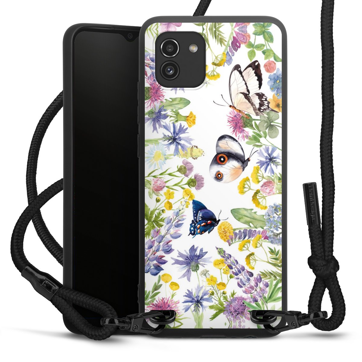 The matt black silicone case is made of flexible TPU (thermoplastic polyurethane) and offers robust protection. The durable, unbreakable material makes the cover flexible and dimensionally stable at the same time. The matte surface makes your design stand out more and is less susceptible to fingerprints and dirt. The stylish trend accessory fits comfortably in the hand and is perfectly complemented by the fabric (polyester) mobile phone strap. The braided fabric strap is approx. 1.70 metres long with a diameter of approx. 0.5 cm. Due to the special knotting technique, the length of the strap can be adjusted by simply pulling it, so that you can adapt it individually to your wishes. The practical case to wear around your neck is available with the fabric strap in black. As a little icing on the cake, we have provided the strap with a chic metal fastener in matt black. The strap is securely fastened to the case with loops made of high-quality genuine leather and press studs. The ends of the fabric strap are covered with metallic end caps and thus protected from fraying.