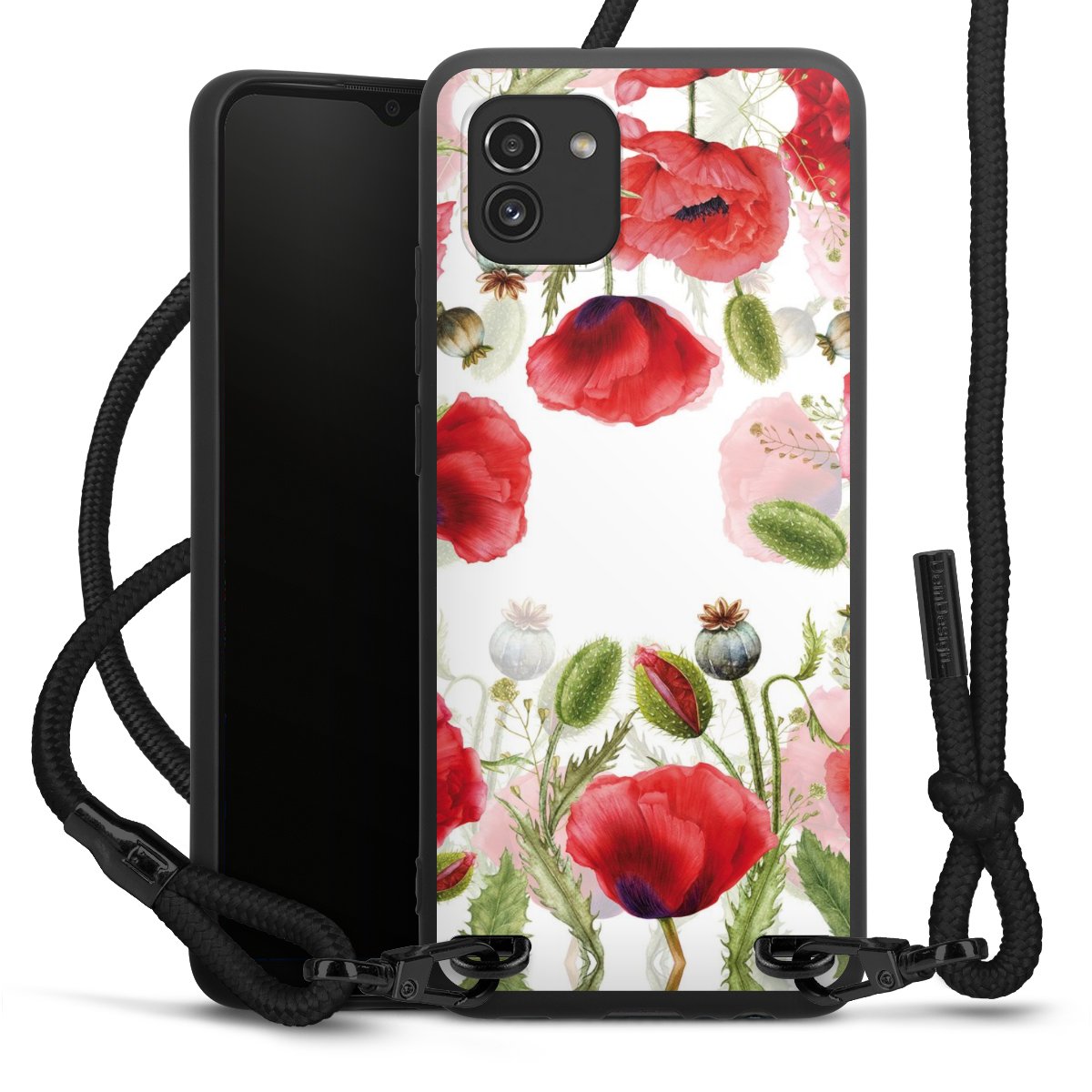 The matt black silicone case is made of flexible TPU (thermoplastic polyurethane) and offers robust protection. The durable, unbreakable material makes the cover flexible and dimensionally stable at the same time. The matte surface makes your design stand out more and is less susceptible to fingerprints and dirt. The stylish trend accessory fits comfortably in the hand and is perfectly complemented by the fabric (polyester) mobile phone strap. The braided fabric strap is approx. 1.70 metres long with a diameter of approx. 0.5 cm. Due to the special knotting technique, the length of the strap can be adjusted by simply pulling it, so that you can adapt it individually to your wishes. The practical case to wear around your neck is available with the fabric strap in black. As a little icing on the cake, we have provided the strap with a chic metal fastener in matt black. The strap is securely fastened to the case with loops made of high-quality genuine leather and press studs. The ends of the fabric strap are covered with metallic end caps and thus protected from fraying.
