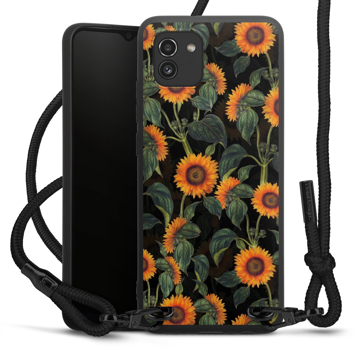 The matt black silicone case is made of flexible TPU (thermoplastic polyurethane) and offers robust protection. The durable, unbreakable material makes the cover flexible and dimensionally stable at the same time. The matte surface makes your design stand out more and is less susceptible to fingerprints and dirt. The stylish trend accessory fits comfortably in the hand and is perfectly complemented by the fabric (polyester) mobile phone strap. The braided fabric strap is approx. 1.70 metres long with a diameter of approx. 0.5 cm. Due to the special knotting technique, the length of the strap can be adjusted by simply pulling it, so that you can adapt it individually to your wishes. The practical case to wear around your neck is available with the fabric strap in black. As a little icing on the cake, we have provided the strap with a chic metal fastener in matt black. The strap is securely fastened to the case with loops made of high-quality genuine leather and press studs. The ends of the fabric strap are covered with metallic end caps and thus protected from fraying.