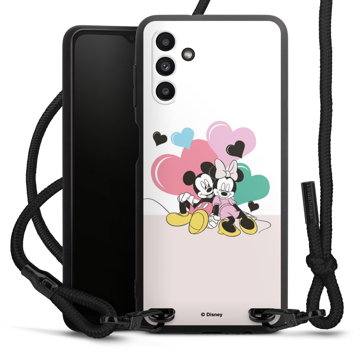 The matt black silicone case is made of flexible TPU (thermoplastic polyurethane) and offers robust protection. The durable, unbreakable material makes the cover flexible and dimensionally stable at the same time. The matte surface makes your design stand out more and is less susceptible to fingerprints and dirt. The stylish trend accessory fits comfortably in the hand and is perfectly complemented by the fabric (polyester) mobile phone strap. The braided fabric strap is approx. 1.70 metres long with a diameter of approx. 0.5 cm. Due to the special knotting technique, the length of the strap can be adjusted by simply pulling it, so that you can adapt it individually to your wishes. The practical case to wear around your neck is available with the fabric strap in black. As a little icing on the cake, we have provided the strap with a chic metal fastener in matt black. The strap is securely fastened to the case with loops made of high-quality genuine leather and press studs. The ends of the fabric strap are covered with metallic end caps and thus protected from fraying.