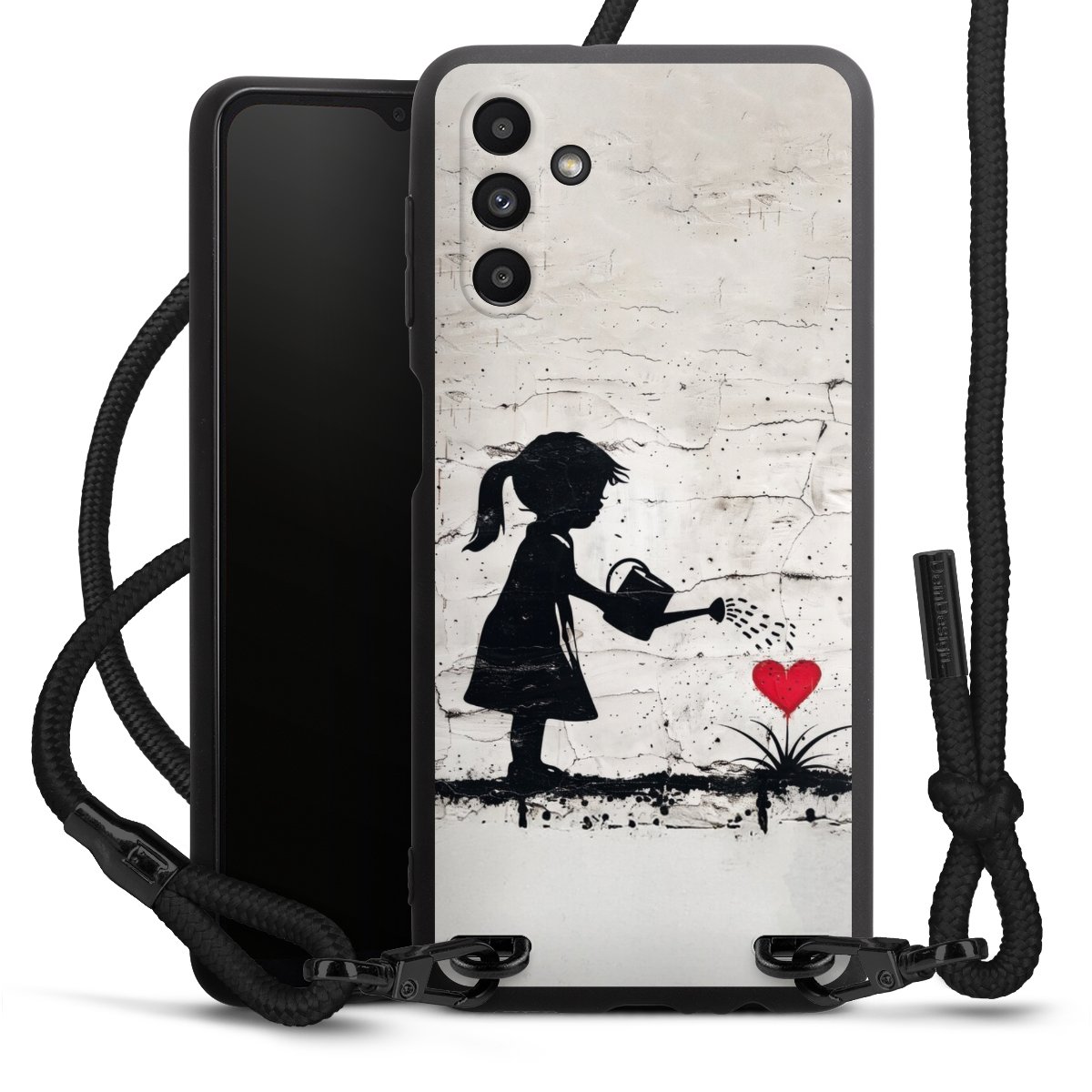 The matt black silicone case is made of flexible TPU (thermoplastic polyurethane) and offers robust protection. The durable, unbreakable material makes the cover flexible and dimensionally stable at the same time. The matte surface makes your design stand out more and is less susceptible to fingerprints and dirt. The stylish trend accessory fits comfortably in the hand and is perfectly complemented by the fabric (polyester) mobile phone strap. The braided fabric strap is approx. 1.70 metres long with a diameter of approx. 0.5 cm. Due to the special knotting technique, the length of the strap can be adjusted by simply pulling it, so that you can adapt it individually to your wishes. The practical case to wear around your neck is available with the fabric strap in black. As a little icing on the cake, we have provided the strap with a chic metal fastener in matt black. The strap is securely fastened to the case with loops made of high-quality genuine leather and press studs. The ends of the fabric strap are covered with metallic end caps and thus protected from fraying.