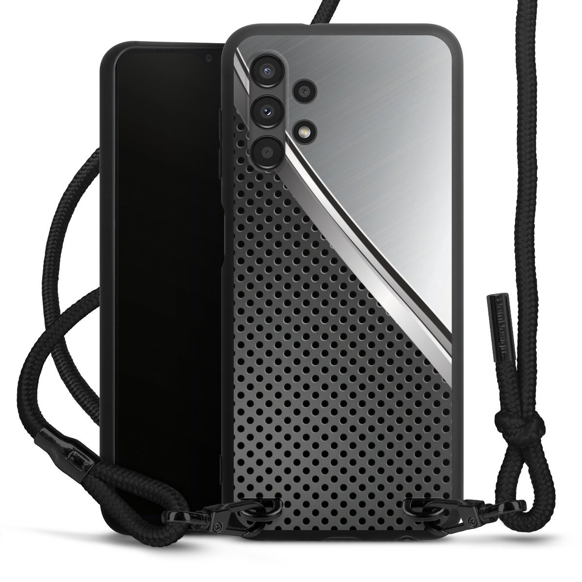 The matt black silicone case is made of flexible TPU (thermoplastic polyurethane) and offers robust protection. The durable, unbreakable material makes the cover flexible and dimensionally stable at the same time. The matte surface makes your design stand out more and is less susceptible to fingerprints and dirt. The stylish trend accessory fits comfortably in the hand and is perfectly complemented by the fabric (polyester) mobile phone strap. The braided fabric strap is approx. 1.70 metres long with a diameter of approx. 0.5 cm. Due to the special knotting technique, the length of the strap can be adjusted by simply pulling it, so that you can adapt it individually to your wishes. The practical case to wear around your neck is available with the fabric strap in black. As a little icing on the cake, we have provided the strap with a chic metal fastener in matt black. The strap is securely fastened to the case with loops made of high-quality genuine leather and press studs. The ends of the fabric strap are covered with metallic end caps and thus protected from fraying.