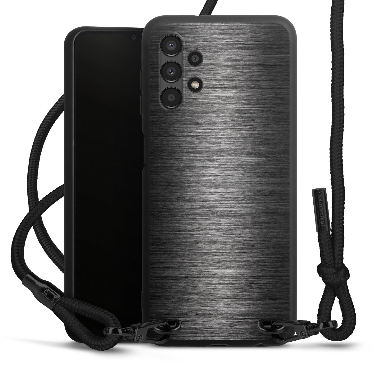The matt black silicone case is made of flexible TPU (thermoplastic polyurethane) and offers robust protection. The durable, unbreakable material makes the cover flexible and dimensionally stable at the same time. The matte surface makes your design stand out more and is less susceptible to fingerprints and dirt. The stylish trend accessory fits comfortably in the hand and is perfectly complemented by the fabric (polyester) mobile phone strap. The braided fabric strap is approx. 1.70 metres long with a diameter of approx. 0.5 cm. Due to the special knotting technique, the length of the strap can be adjusted by simply pulling it, so that you can adapt it individually to your wishes. The practical case to wear around your neck is available with the fabric strap in black. As a little icing on the cake, we have provided the strap with a chic metal fastener in matt black. The strap is securely fastened to the case with loops made of high-quality genuine leather and press studs. The ends of the fabric strap are covered with metallic end caps and thus protected from fraying.