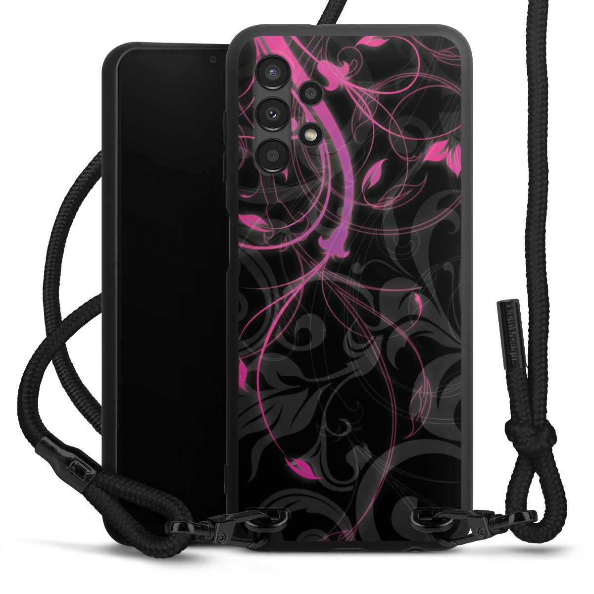 The matt black silicone case is made of flexible TPU (thermoplastic polyurethane) and offers robust protection. The durable, unbreakable material makes the cover flexible and dimensionally stable at the same time. The matte surface makes your design stand out more and is less susceptible to fingerprints and dirt. The stylish trend accessory fits comfortably in the hand and is perfectly complemented by the fabric (polyester) mobile phone strap. The braided fabric strap is approx. 1.70 metres long with a diameter of approx. 0.5 cm. Due to the special knotting technique, the length of the strap can be adjusted by simply pulling it, so that you can adapt it individually to your wishes. The practical case to wear around your neck is available with the fabric strap in black. As a little icing on the cake, we have provided the strap with a chic metal fastener in matt black. The strap is securely fastened to the case with loops made of high-quality genuine leather and press studs. The ends of the fabric strap are covered with metallic end caps and thus protected from fraying.