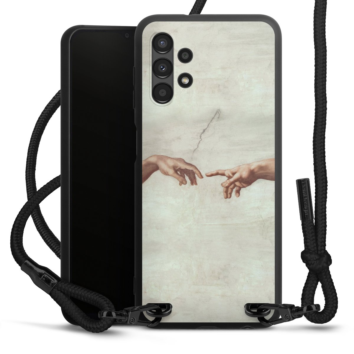 The matt black silicone case is made of flexible TPU (thermoplastic polyurethane) and offers robust protection. The durable, unbreakable material makes the cover flexible and dimensionally stable at the same time. The matte surface makes your design stand out more and is less susceptible to fingerprints and dirt. The stylish trend accessory fits comfortably in the hand and is perfectly complemented by the fabric (polyester) mobile phone strap. The braided fabric strap is approx. 1.70 metres long with a diameter of approx. 0.5 cm. Due to the special knotting technique, the length of the strap can be adjusted by simply pulling it, so that you can adapt it individually to your wishes. The practical case to wear around your neck is available with the fabric strap in black. As a little icing on the cake, we have provided the strap with a chic metal fastener in matt black. The strap is securely fastened to the case with loops made of high-quality genuine leather and press studs. The ends of the fabric strap are covered with metallic end caps and thus protected from fraying.