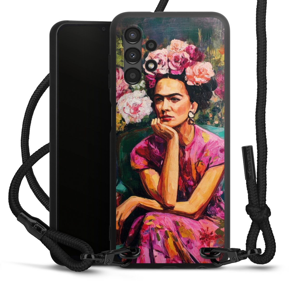 The matt black silicone case is made of flexible TPU (thermoplastic polyurethane) and offers robust protection. The durable, unbreakable material makes the cover flexible and dimensionally stable at the same time. The matte surface makes your design stand out more and is less susceptible to fingerprints and dirt. The stylish trend accessory fits comfortably in the hand and is perfectly complemented by the fabric (polyester) mobile phone strap. The braided fabric strap is approx. 1.70 metres long with a diameter of approx. 0.5 cm. Due to the special knotting technique, the length of the strap can be adjusted by simply pulling it, so that you can adapt it individually to your wishes. The practical case to wear around your neck is available with the fabric strap in black. As a little icing on the cake, we have provided the strap with a chic metal fastener in matt black. The strap is securely fastened to the case with loops made of high-quality genuine leather and press studs. The ends of the fabric strap are covered with metallic end caps and thus protected from fraying.