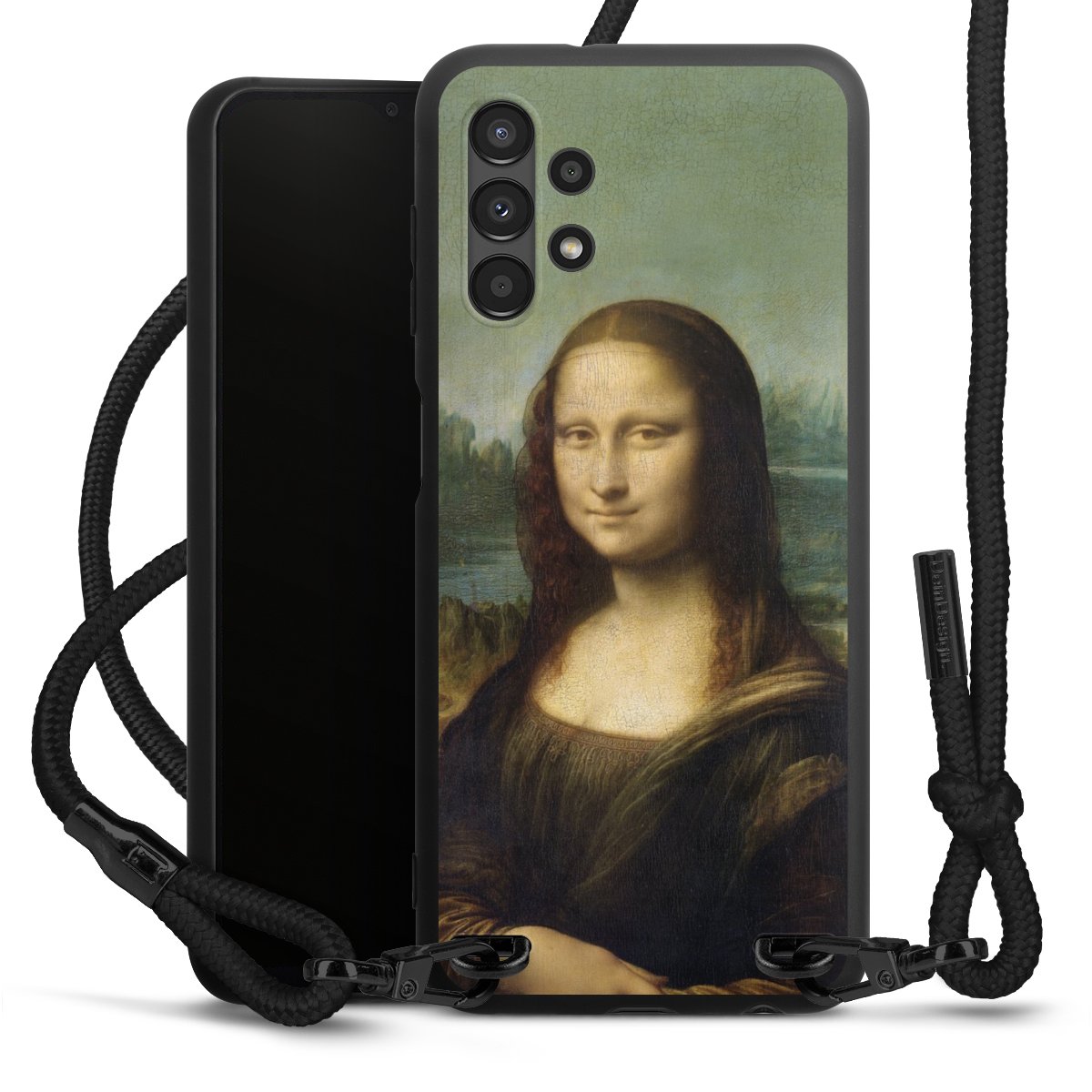 The matt black silicone case is made of flexible TPU (thermoplastic polyurethane) and offers robust protection. The durable, unbreakable material makes the cover flexible and dimensionally stable at the same time. The matte surface makes your design stand out more and is less susceptible to fingerprints and dirt. The stylish trend accessory fits comfortably in the hand and is perfectly complemented by the fabric (polyester) mobile phone strap. The braided fabric strap is approx. 1.70 metres long with a diameter of approx. 0.5 cm. Due to the special knotting technique, the length of the strap can be adjusted by simply pulling it, so that you can adapt it individually to your wishes. The practical case to wear around your neck is available with the fabric strap in black. As a little icing on the cake, we have provided the strap with a chic metal fastener in matt black. The strap is securely fastened to the case with loops made of high-quality genuine leather and press studs. The ends of the fabric strap are covered with metallic end caps and thus protected from fraying.