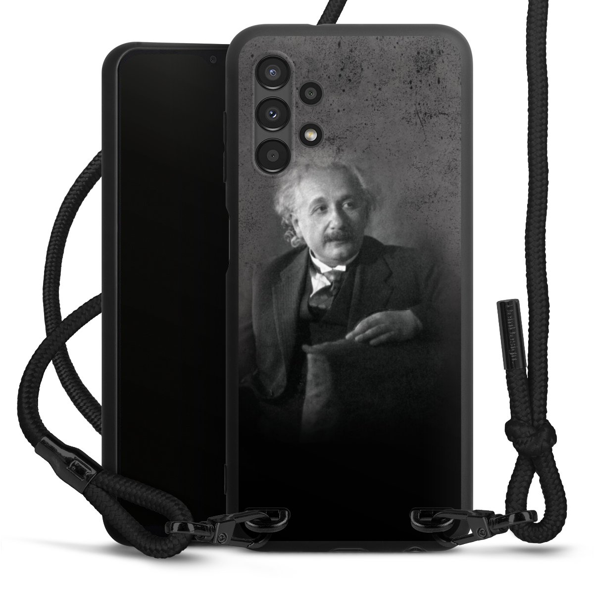 The matt black silicone case is made of flexible TPU (thermoplastic polyurethane) and offers robust protection. The durable, unbreakable material makes the cover flexible and dimensionally stable at the same time. The matte surface makes your design stand out more and is less susceptible to fingerprints and dirt. The stylish trend accessory fits comfortably in the hand and is perfectly complemented by the fabric (polyester) mobile phone strap. The braided fabric strap is approx. 1.70 metres long with a diameter of approx. 0.5 cm. Due to the special knotting technique, the length of the strap can be adjusted by simply pulling it, so that you can adapt it individually to your wishes. The practical case to wear around your neck is available with the fabric strap in black. As a little icing on the cake, we have provided the strap with a chic metal fastener in matt black. The strap is securely fastened to the case with loops made of high-quality genuine leather and press studs. The ends of the fabric strap are covered with metallic end caps and thus protected from fraying.