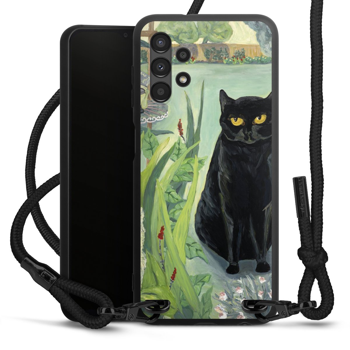 The matt black silicone case is made of flexible TPU (thermoplastic polyurethane) and offers robust protection. The durable, unbreakable material makes the cover flexible and dimensionally stable at the same time. The matte surface makes your design stand out more and is less susceptible to fingerprints and dirt. The stylish trend accessory fits comfortably in the hand and is perfectly complemented by the fabric (polyester) mobile phone strap. The braided fabric strap is approx. 1.70 metres long with a diameter of approx. 0.5 cm. Due to the special knotting technique, the length of the strap can be adjusted by simply pulling it, so that you can adapt it individually to your wishes. The practical case to wear around your neck is available with the fabric strap in black. As a little icing on the cake, we have provided the strap with a chic metal fastener in matt black. The strap is securely fastened to the case with loops made of high-quality genuine leather and press studs. The ends of the fabric strap are covered with metallic end caps and thus protected from fraying.
