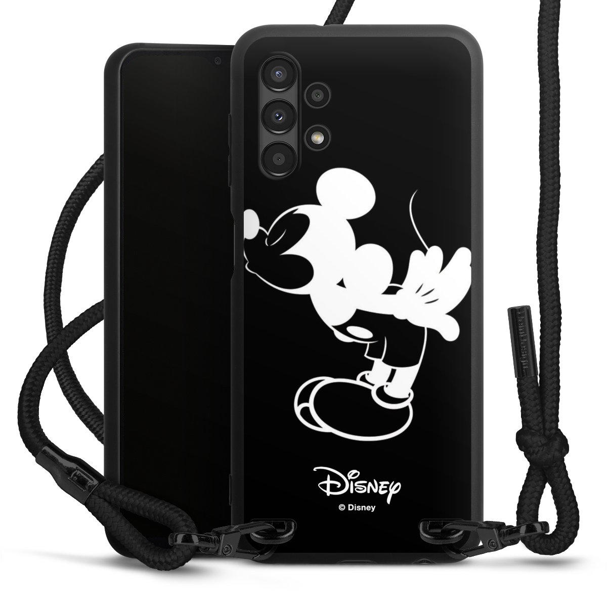 The matt black silicone case is made of flexible TPU (thermoplastic polyurethane) and offers robust protection. The durable, unbreakable material makes the cover flexible and dimensionally stable at the same time. The matte surface makes your design stand out more and is less susceptible to fingerprints and dirt. The stylish trend accessory fits comfortably in the hand and is perfectly complemented by the fabric (polyester) mobile phone strap. The braided fabric strap is approx. 1.70 metres long with a diameter of approx. 0.5 cm. Due to the special knotting technique, the length of the strap can be adjusted by simply pulling it, so that you can adapt it individually to your wishes. The practical case to wear around your neck is available with the fabric strap in black. As a little icing on the cake, we have provided the strap with a chic metal fastener in matt black. The strap is securely fastened to the case with loops made of high-quality genuine leather and press studs. The ends of the fabric strap are covered with metallic end caps and thus protected from fraying.