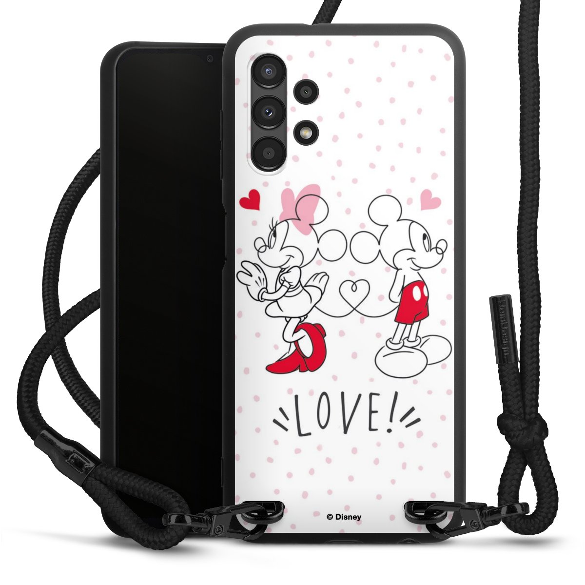 The matt black silicone case is made of flexible TPU (thermoplastic polyurethane) and offers robust protection. The durable, unbreakable material makes the cover flexible and dimensionally stable at the same time. The matte surface makes your design stand out more and is less susceptible to fingerprints and dirt. The stylish trend accessory fits comfortably in the hand and is perfectly complemented by the fabric (polyester) mobile phone strap. The braided fabric strap is approx. 1.70 metres long with a diameter of approx. 0.5 cm. Due to the special knotting technique, the length of the strap can be adjusted by simply pulling it, so that you can adapt it individually to your wishes. The practical case to wear around your neck is available with the fabric strap in black. As a little icing on the cake, we have provided the strap with a chic metal fastener in matt black. The strap is securely fastened to the case with loops made of high-quality genuine leather and press studs. The ends of the fabric strap are covered with metallic end caps and thus protected from fraying.