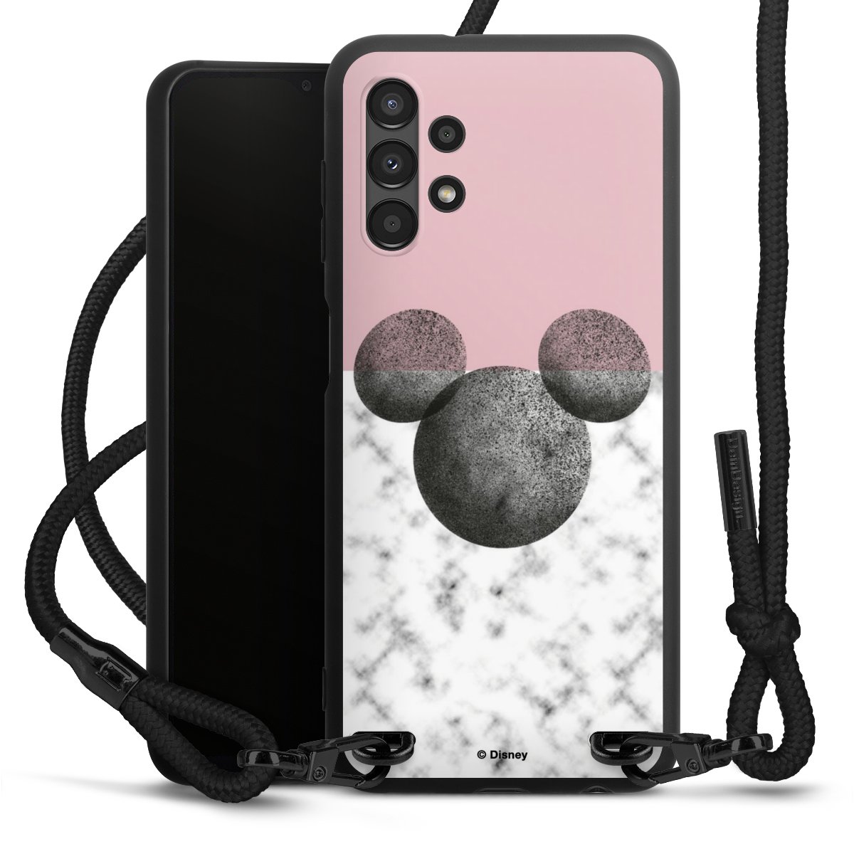 The matt black silicone case is made of flexible TPU (thermoplastic polyurethane) and offers robust protection. The durable, unbreakable material makes the cover flexible and dimensionally stable at the same time. The matte surface makes your design stand out more and is less susceptible to fingerprints and dirt. The stylish trend accessory fits comfortably in the hand and is perfectly complemented by the fabric (polyester) mobile phone strap. The braided fabric strap is approx. 1.70 metres long with a diameter of approx. 0.5 cm. Due to the special knotting technique, the length of the strap can be adjusted by simply pulling it, so that you can adapt it individually to your wishes. The practical case to wear around your neck is available with the fabric strap in black. As a little icing on the cake, we have provided the strap with a chic metal fastener in matt black. The strap is securely fastened to the case with loops made of high-quality genuine leather and press studs. The ends of the fabric strap are covered with metallic end caps and thus protected from fraying.
