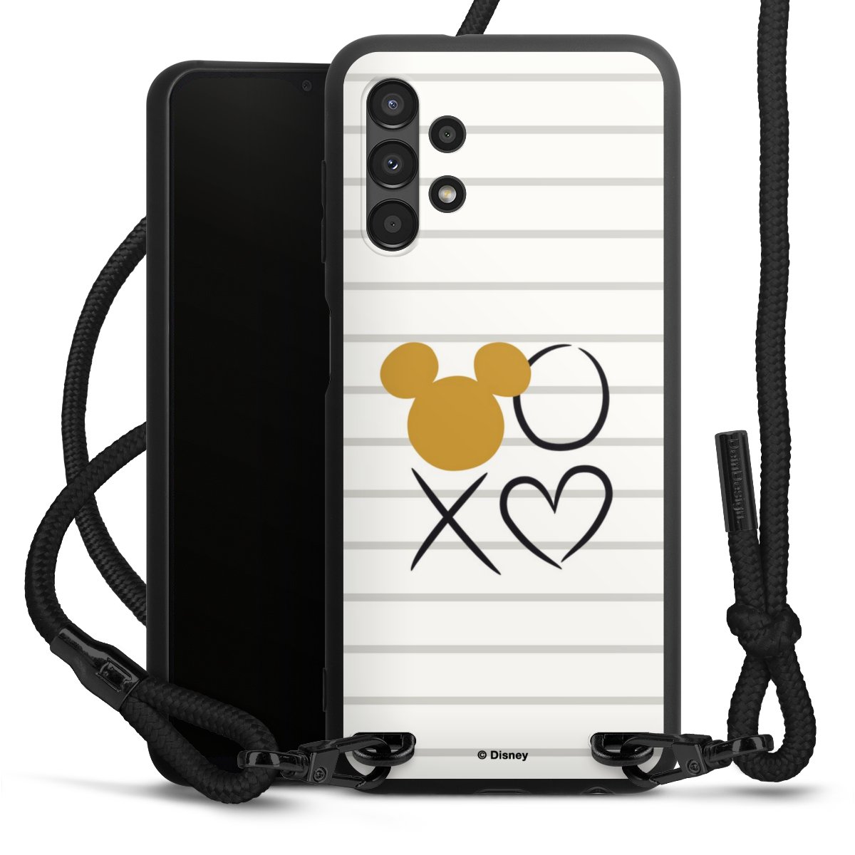 The matt black silicone case is made of flexible TPU (thermoplastic polyurethane) and offers robust protection. The durable, unbreakable material makes the cover flexible and dimensionally stable at the same time. The matte surface makes your design stand out more and is less susceptible to fingerprints and dirt. The stylish trend accessory fits comfortably in the hand and is perfectly complemented by the fabric (polyester) mobile phone strap. The braided fabric strap is approx. 1.70 metres long with a diameter of approx. 0.5 cm. Due to the special knotting technique, the length of the strap can be adjusted by simply pulling it, so that you can adapt it individually to your wishes. The practical case to wear around your neck is available with the fabric strap in black. As a little icing on the cake, we have provided the strap with a chic metal fastener in matt black. The strap is securely fastened to the case with loops made of high-quality genuine leather and press studs. The ends of the fabric strap are covered with metallic end caps and thus protected from fraying.